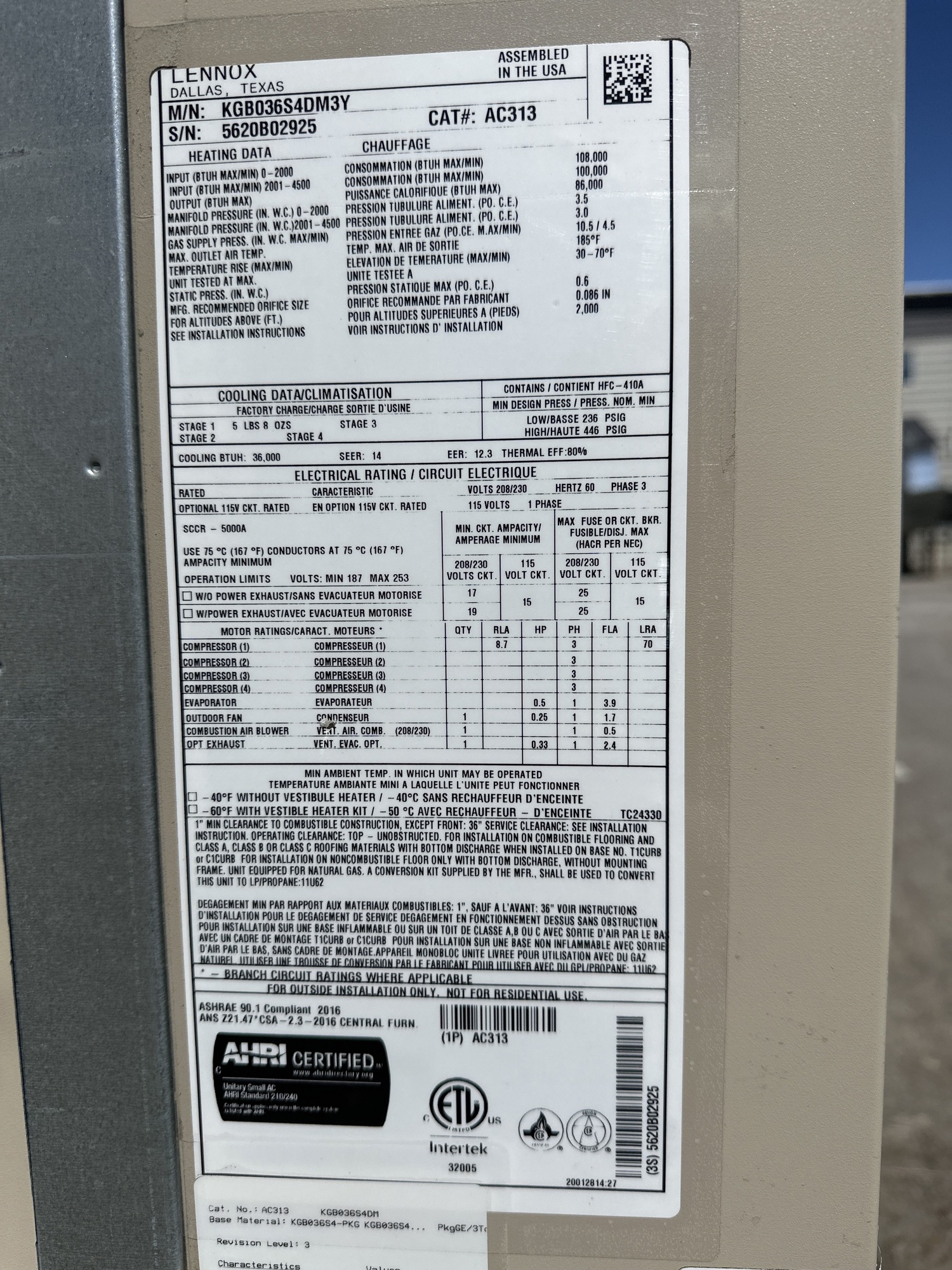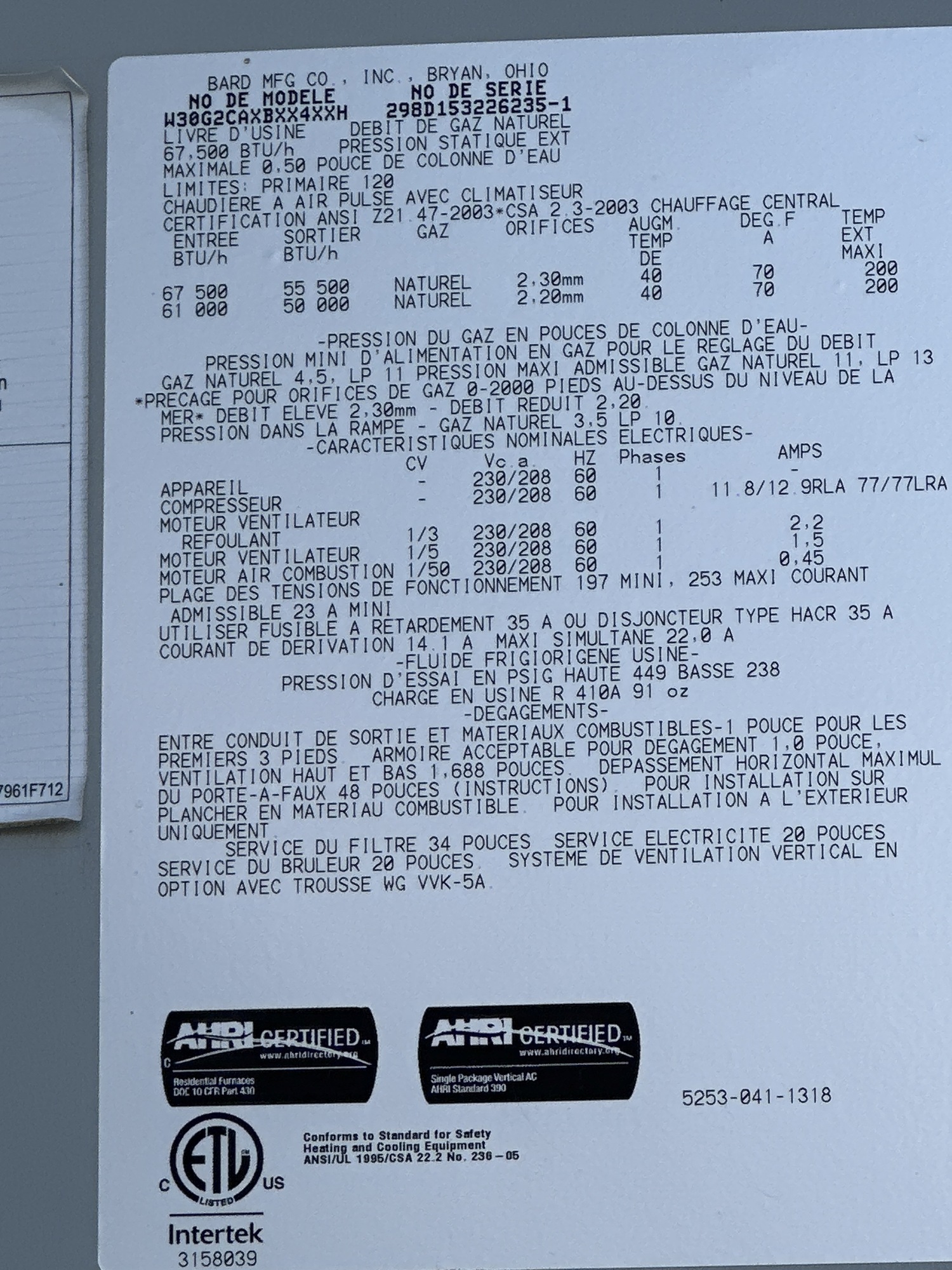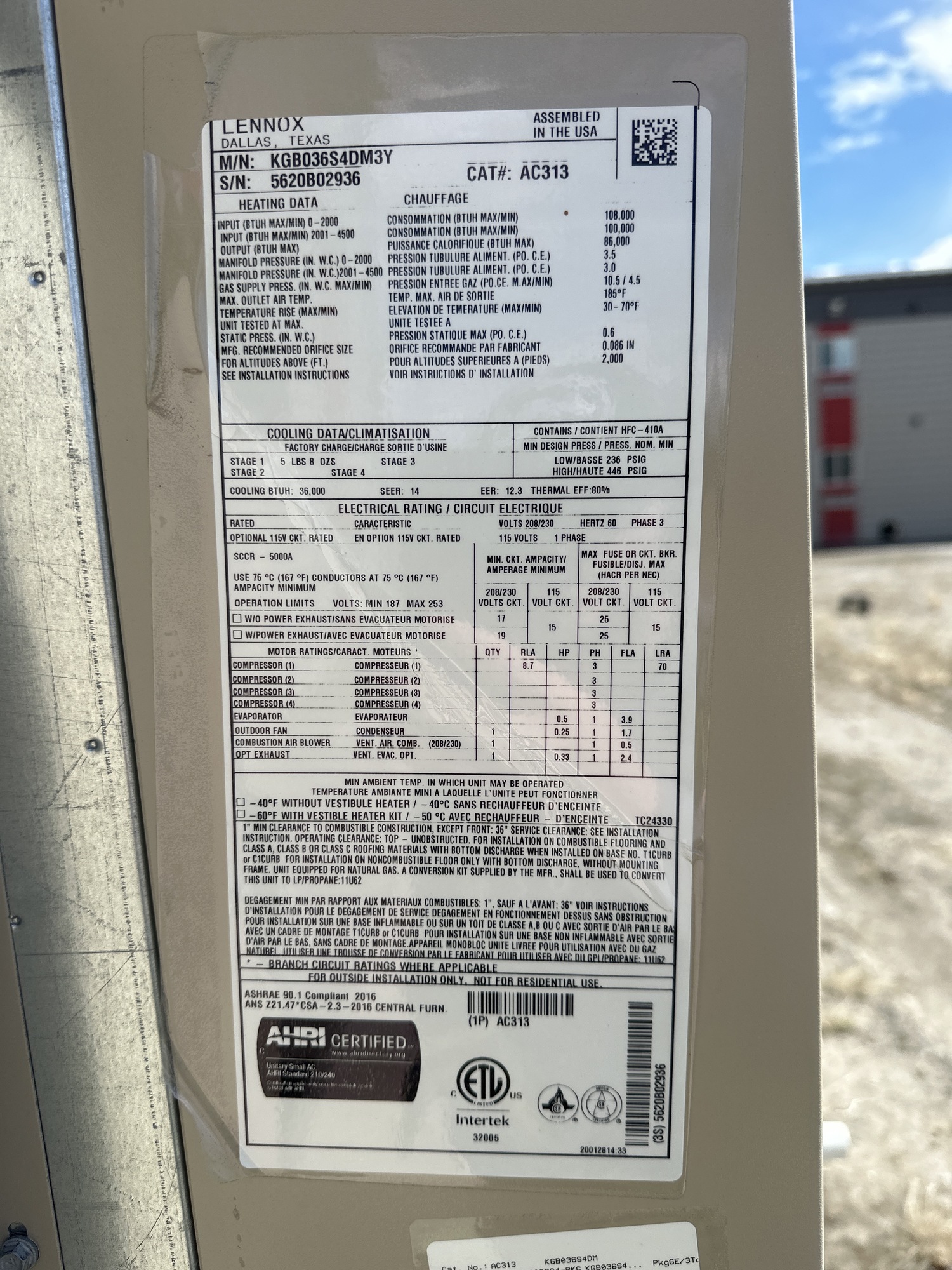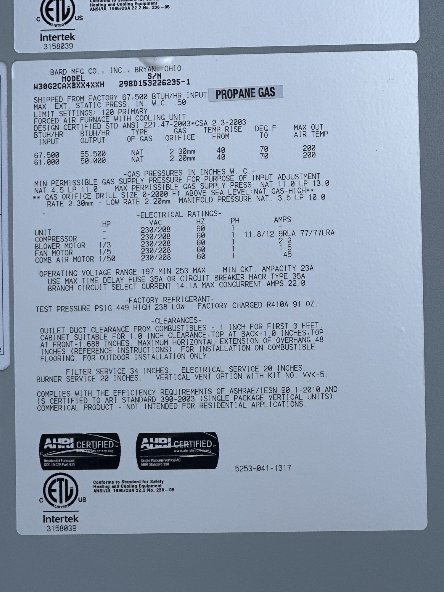 Forced Air Furnace w/ Cooling Unit Tag*