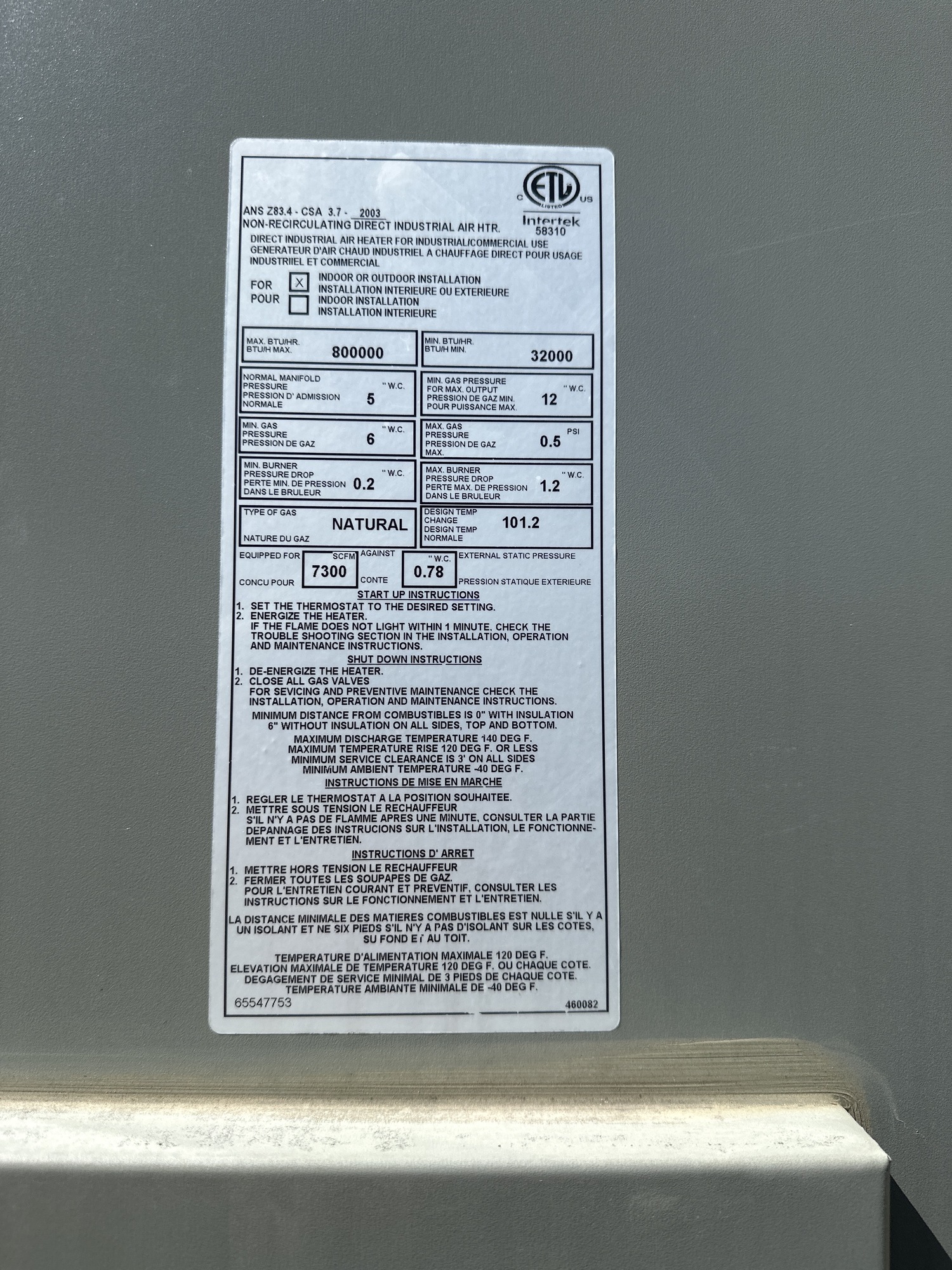 Manifold Pressure: 10 " W.C.