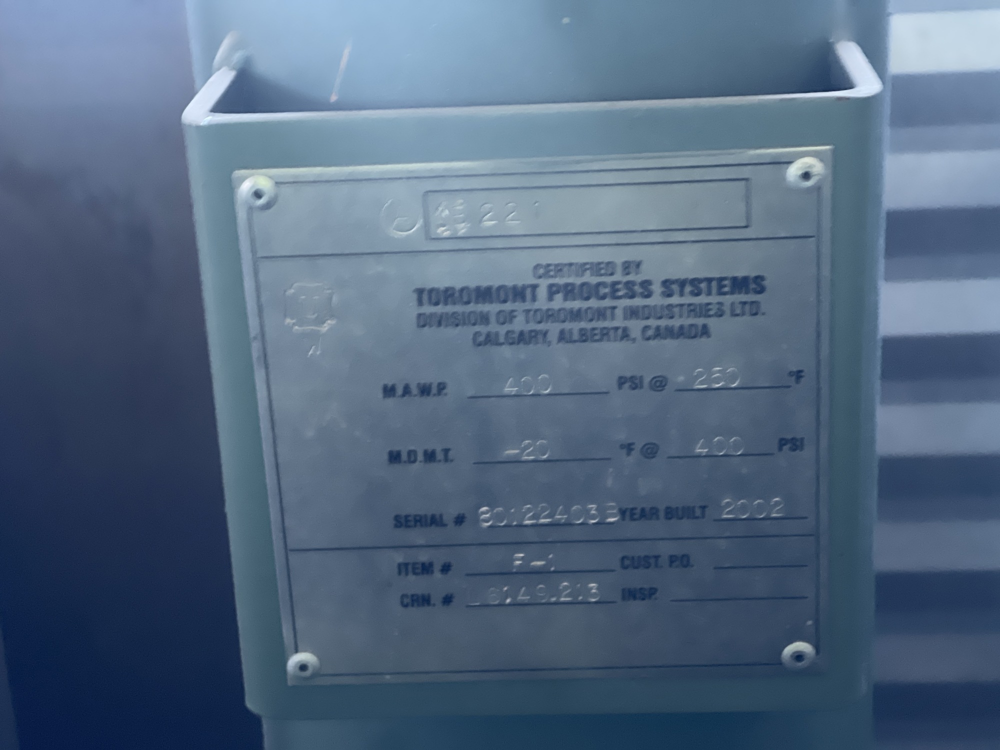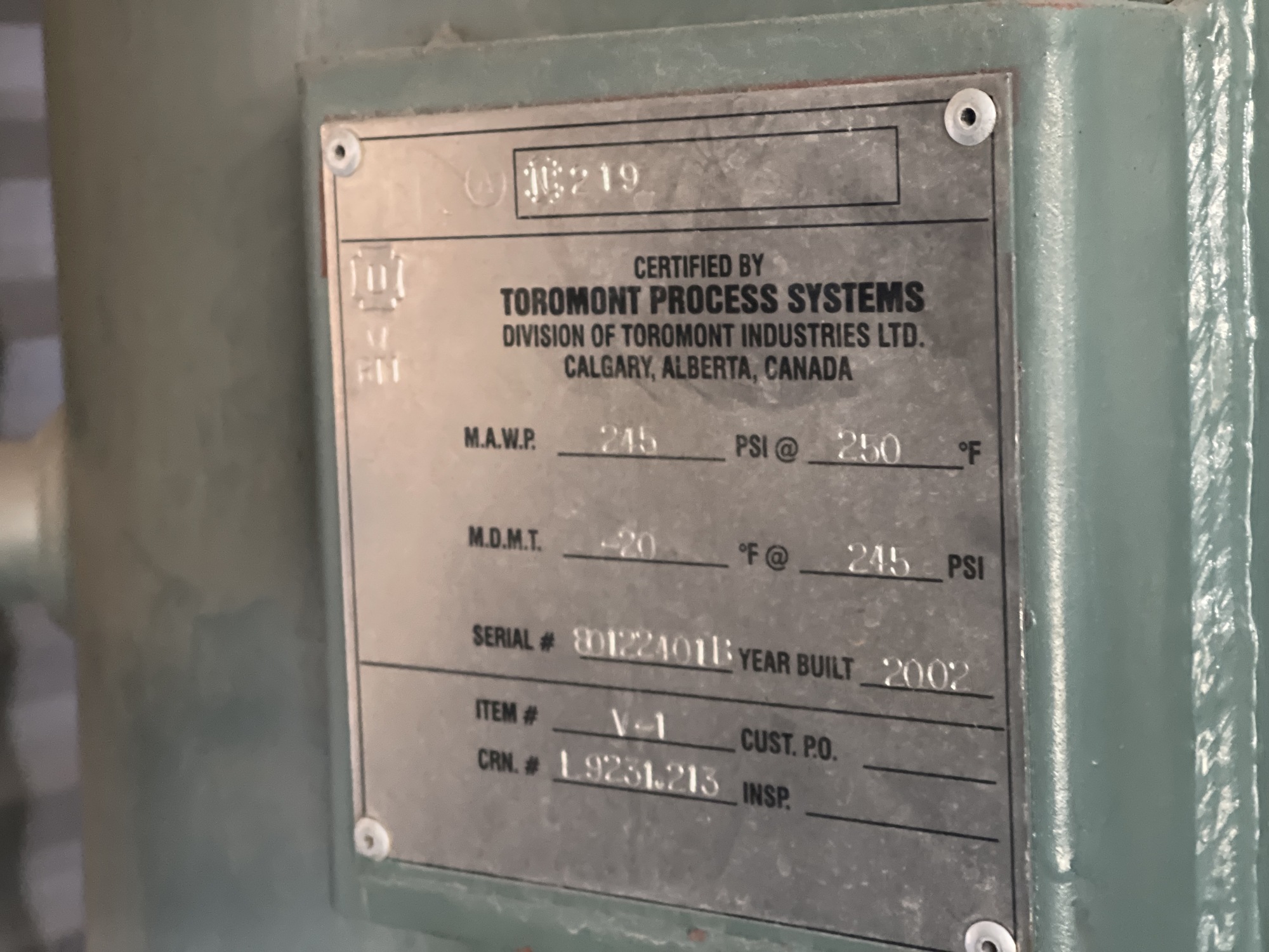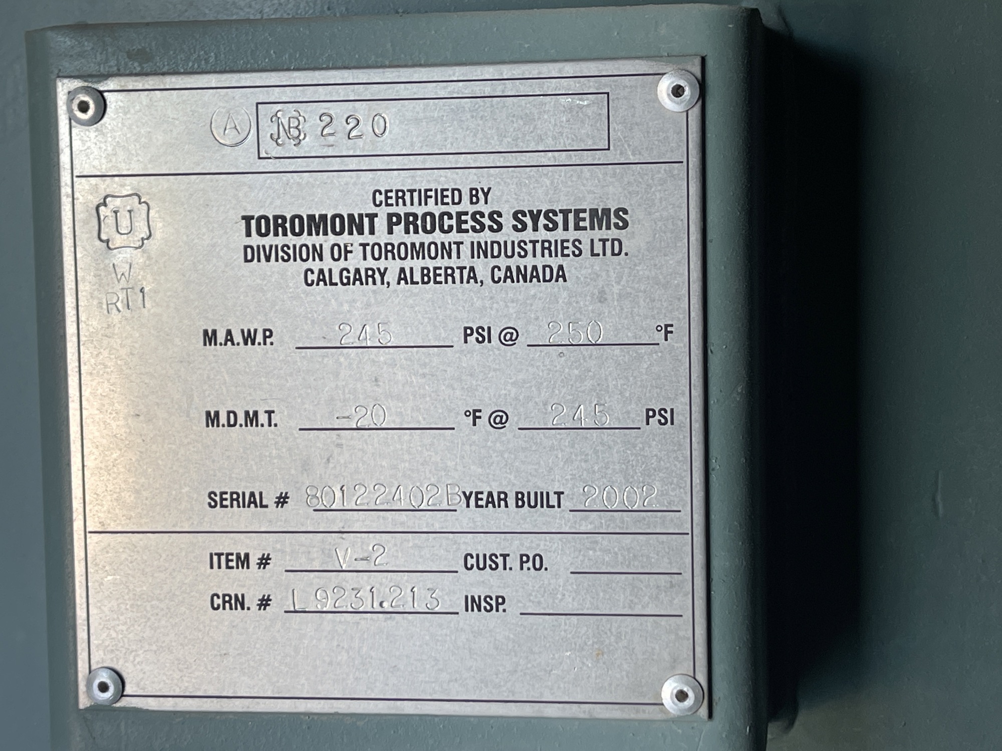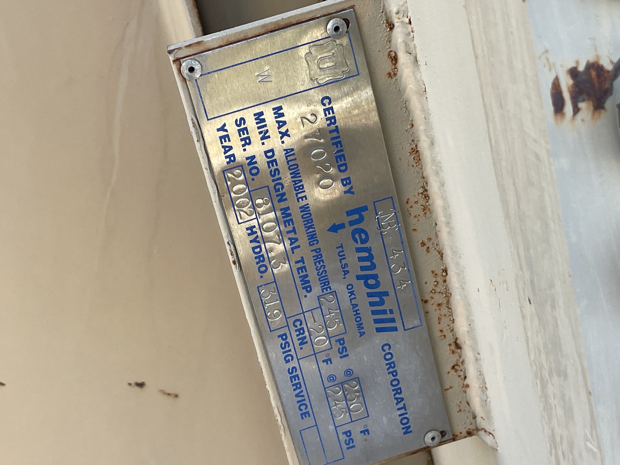 MAWP: 245 PSI @ 250 F