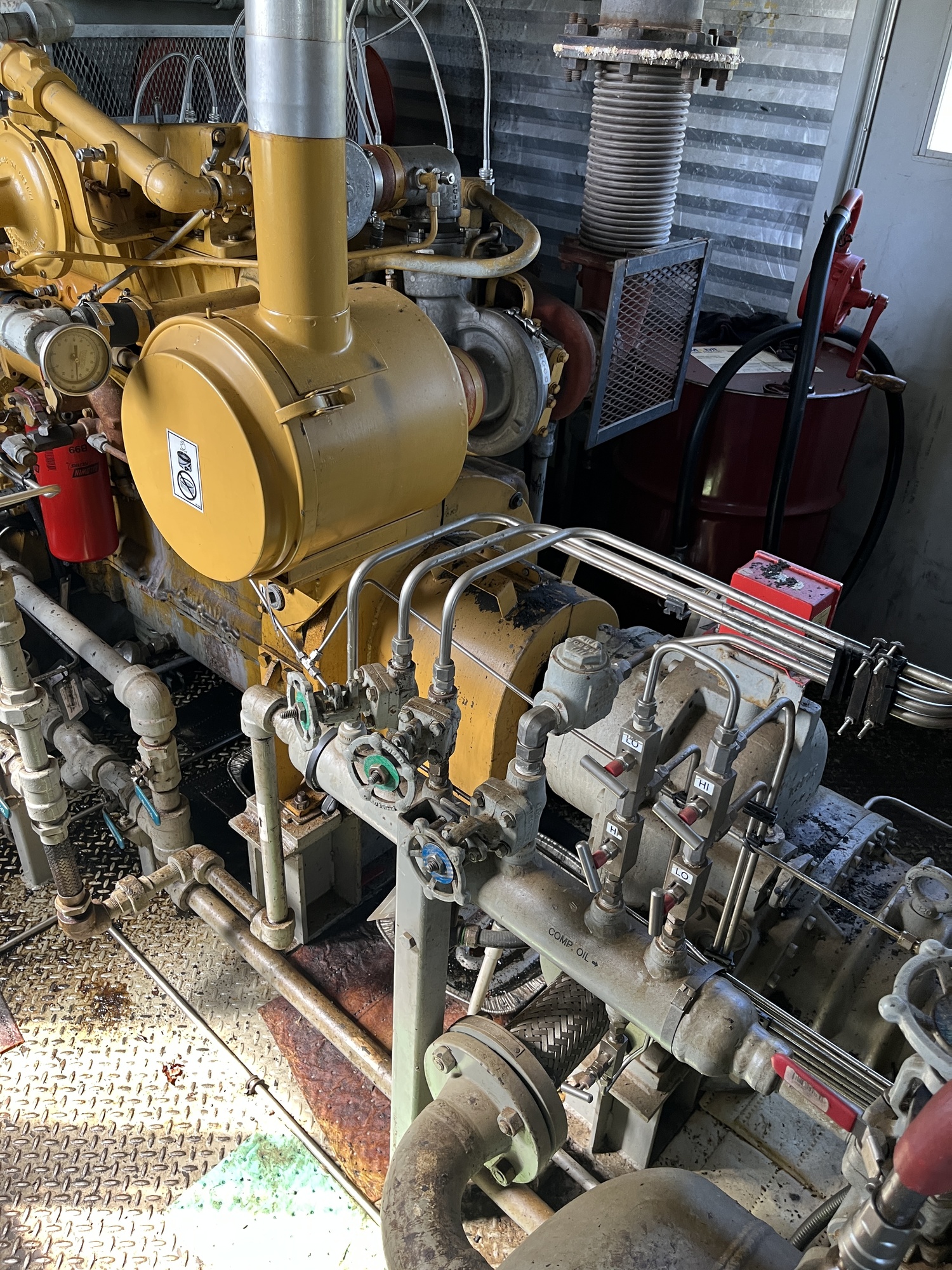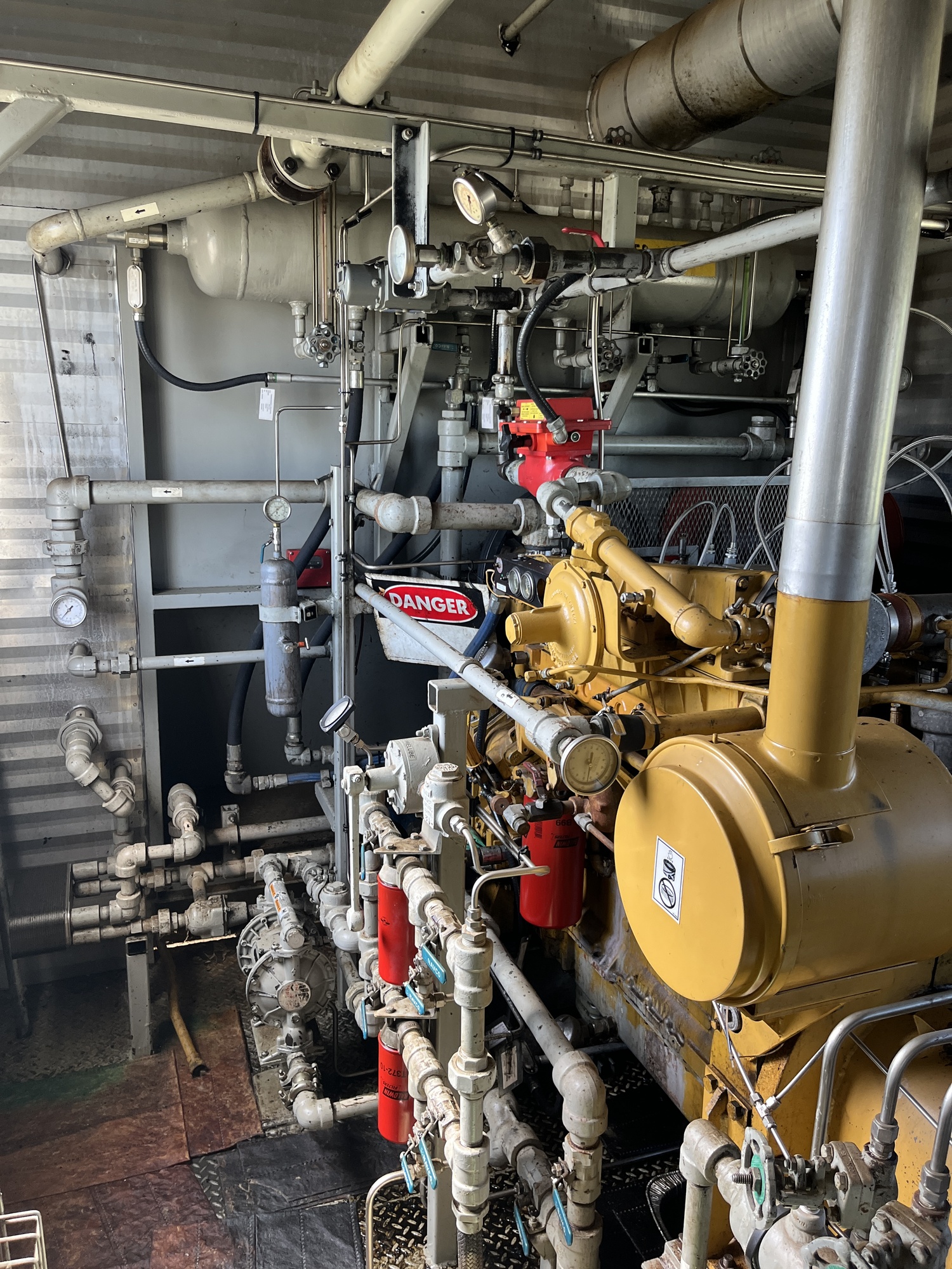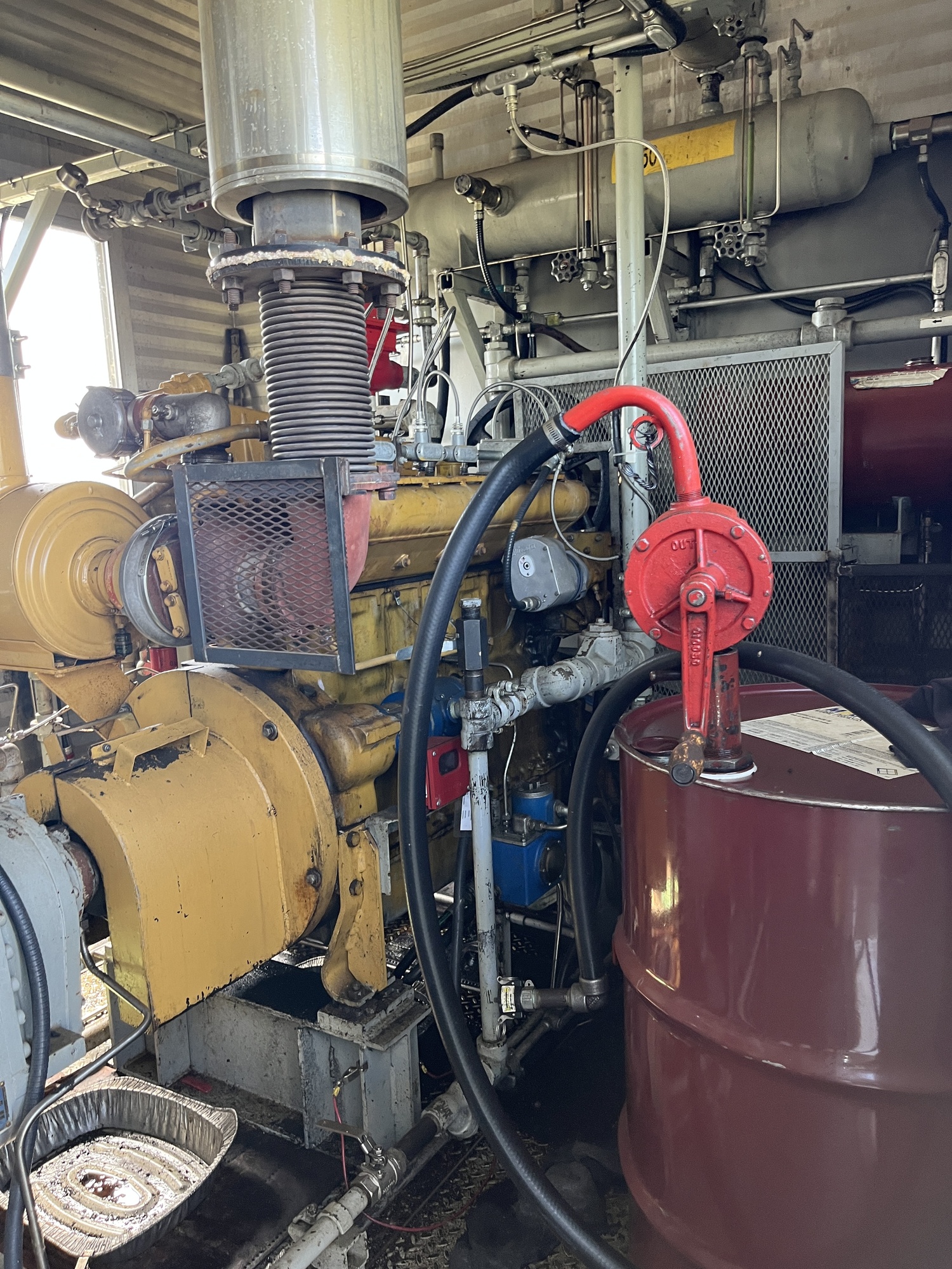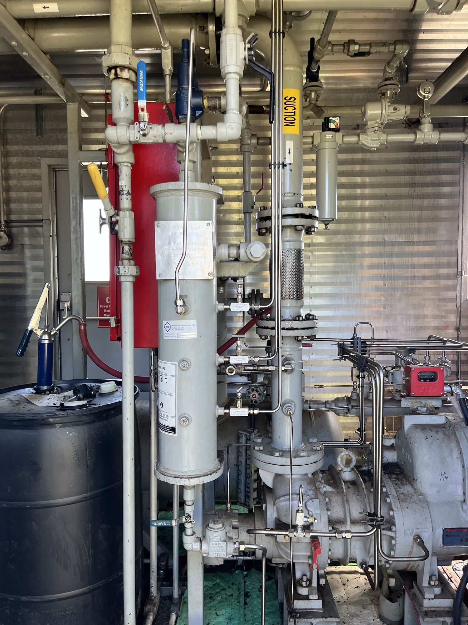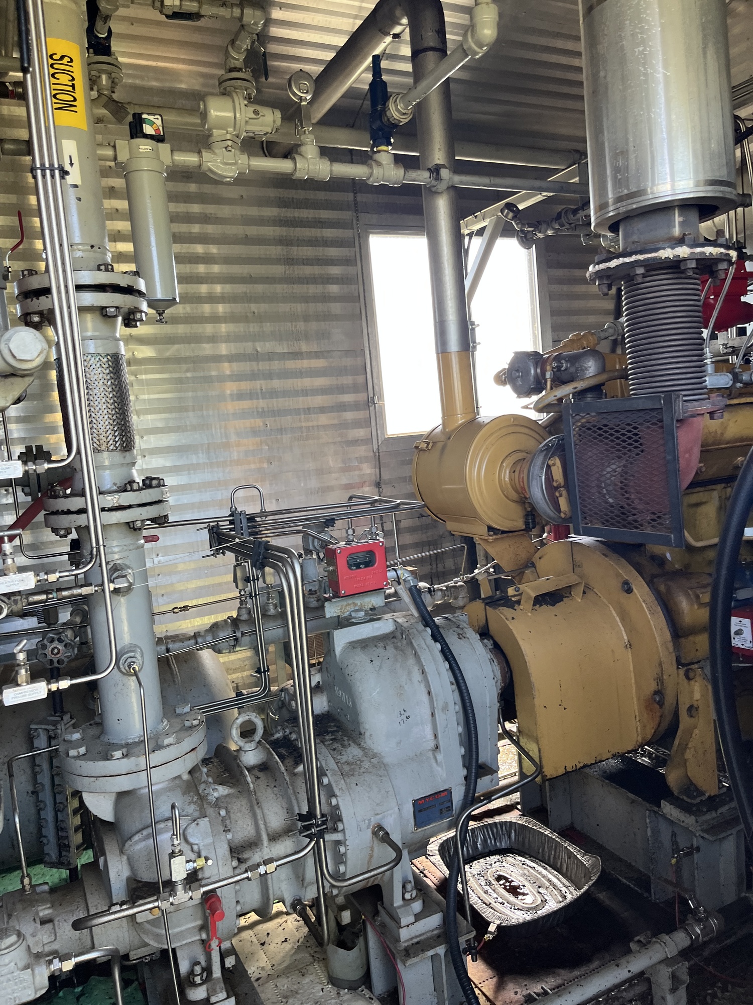Single stage MYCOM SCV-series screw compressor with inline 10.5L 6-cylinder Caterpillar 3306 engine driver inside 10’x25’ building on 15’x40’ cement pad located at FA/16-11-058-13W4