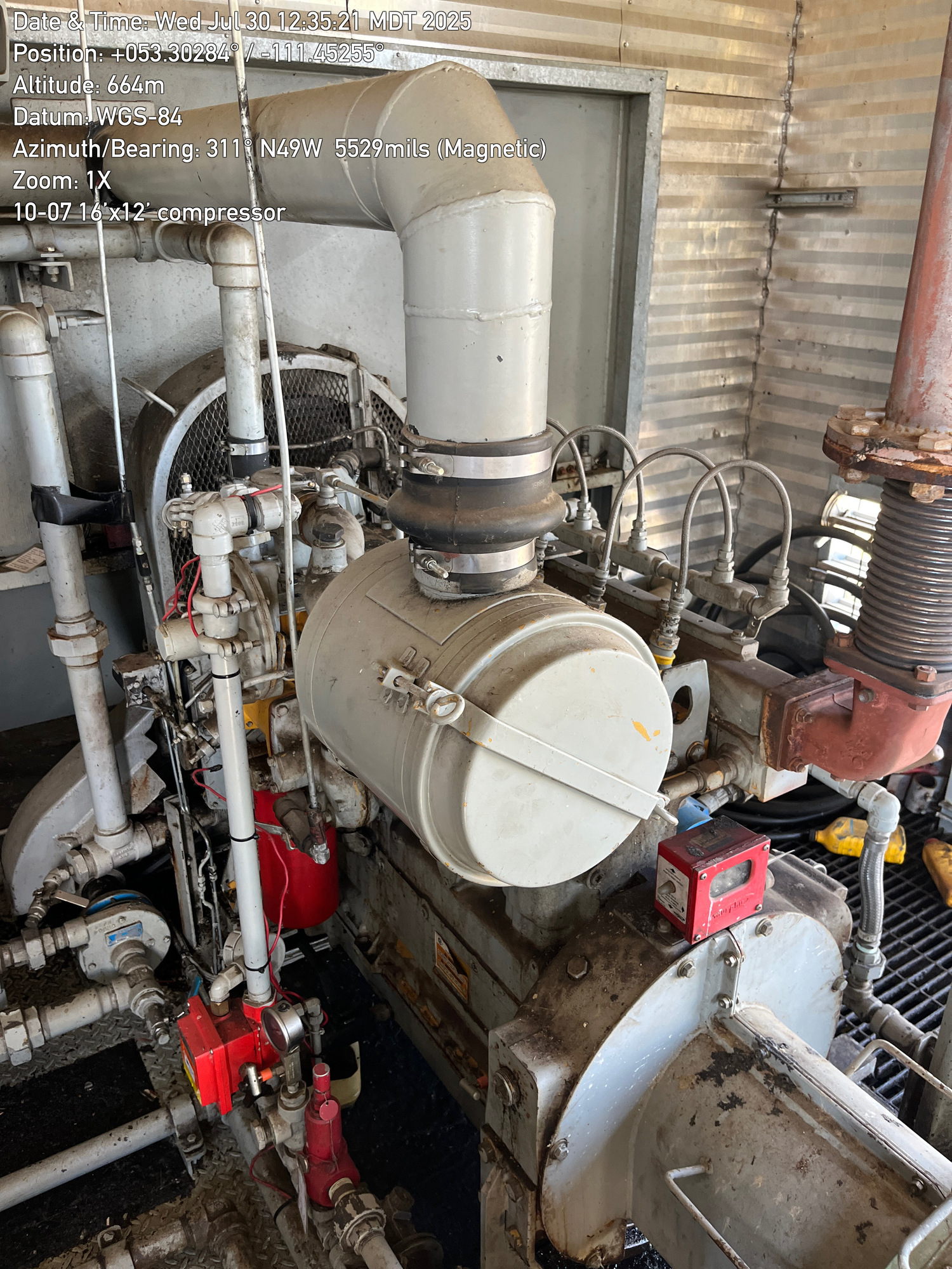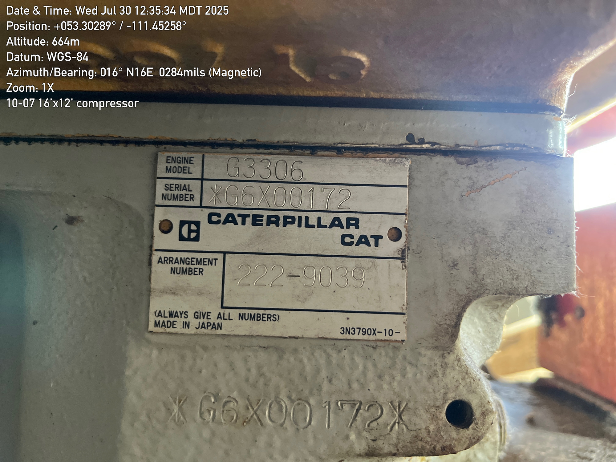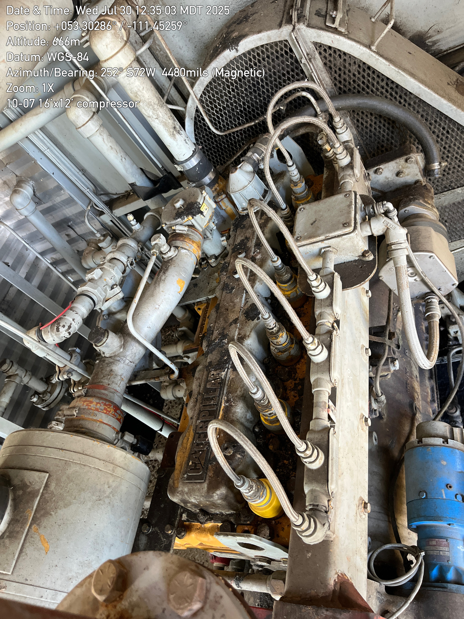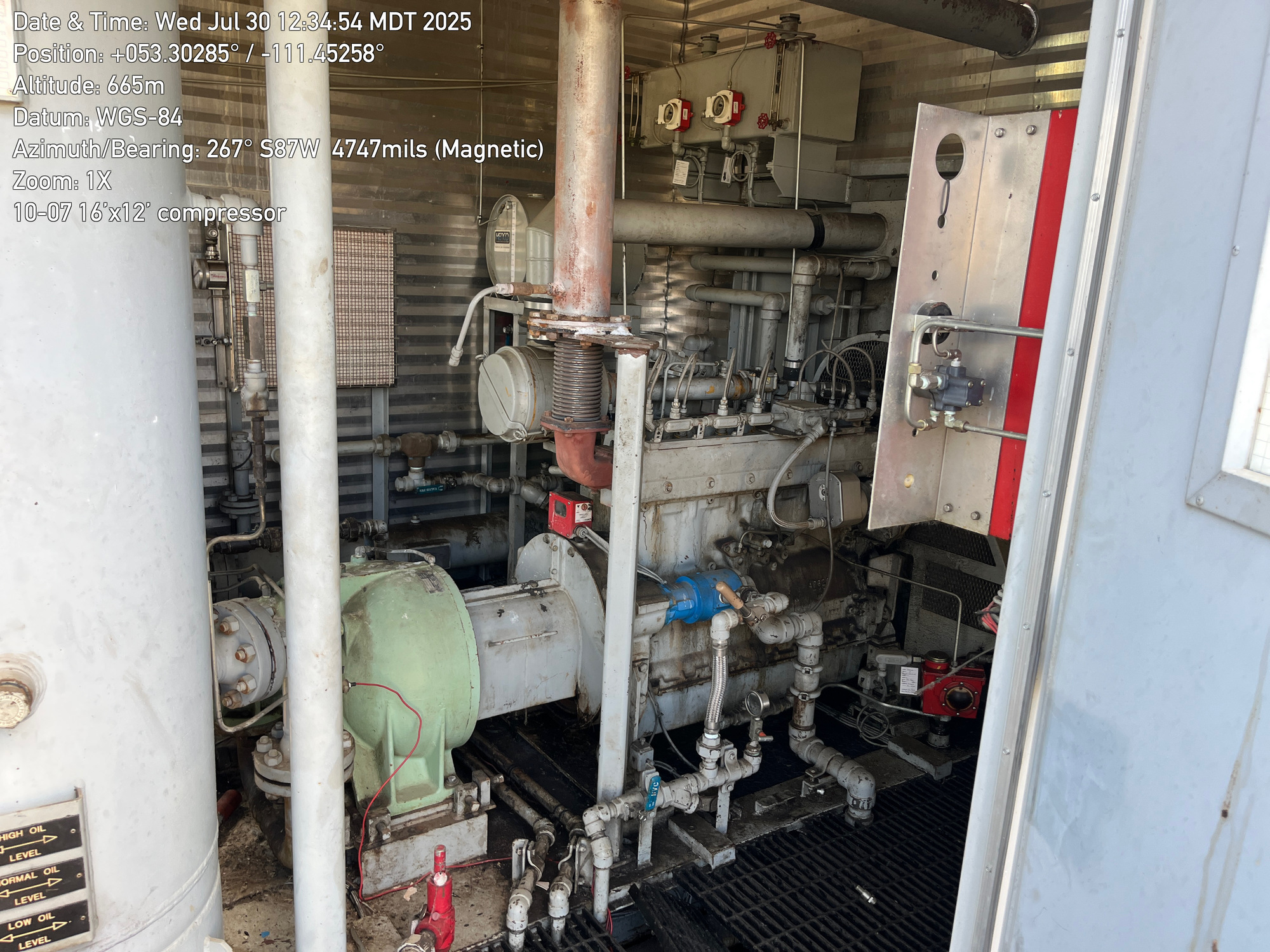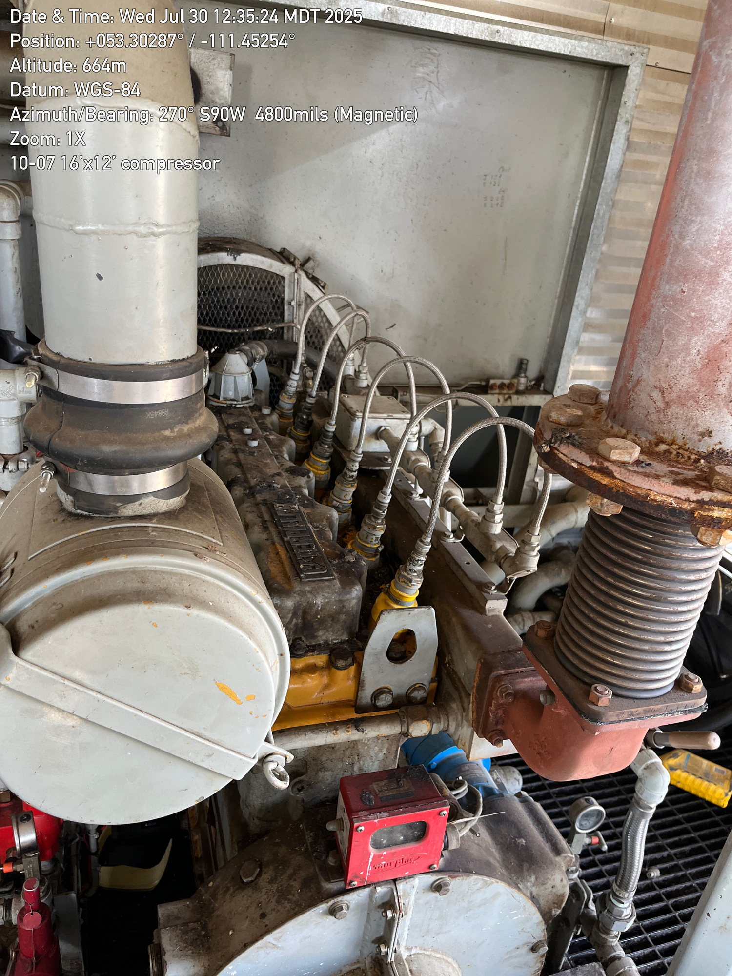 Single stage Sullair compressor with a inline 6 cylinder Caterpillar G3306 engine inside a 16'x12' building located at 10-07-050-10W4 (100)