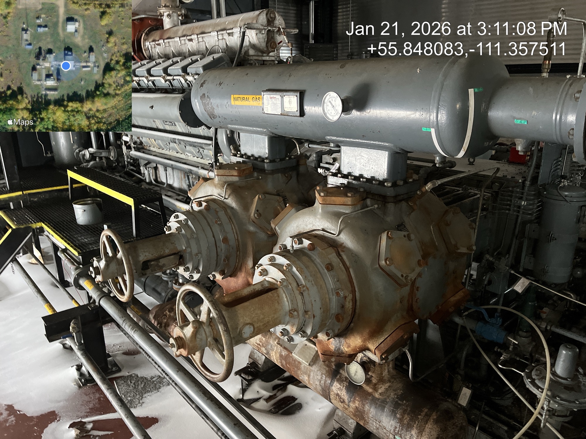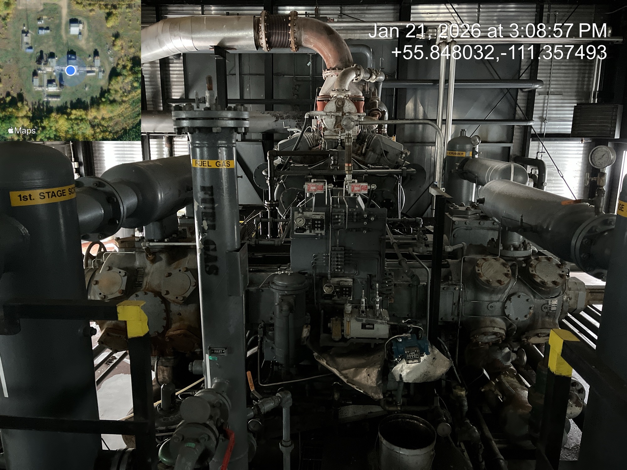 4 stage compressor (ID plate illegible) with a 2000 HP Superior CleanBurn II V12 gas engine inside of a 66.5’x50’ building with a 5 ton crane, located at 12-16-079-09W4 (Facility)
