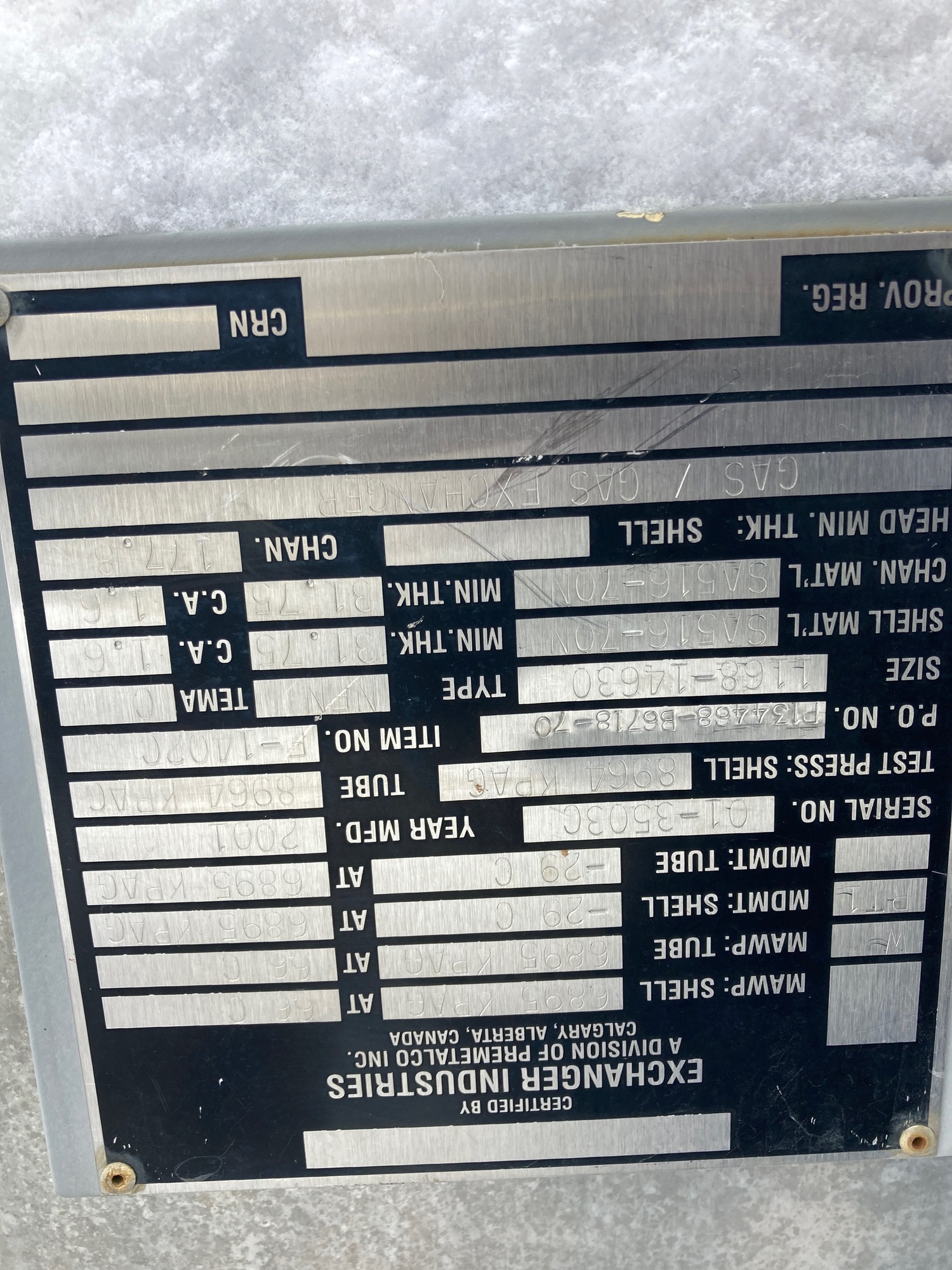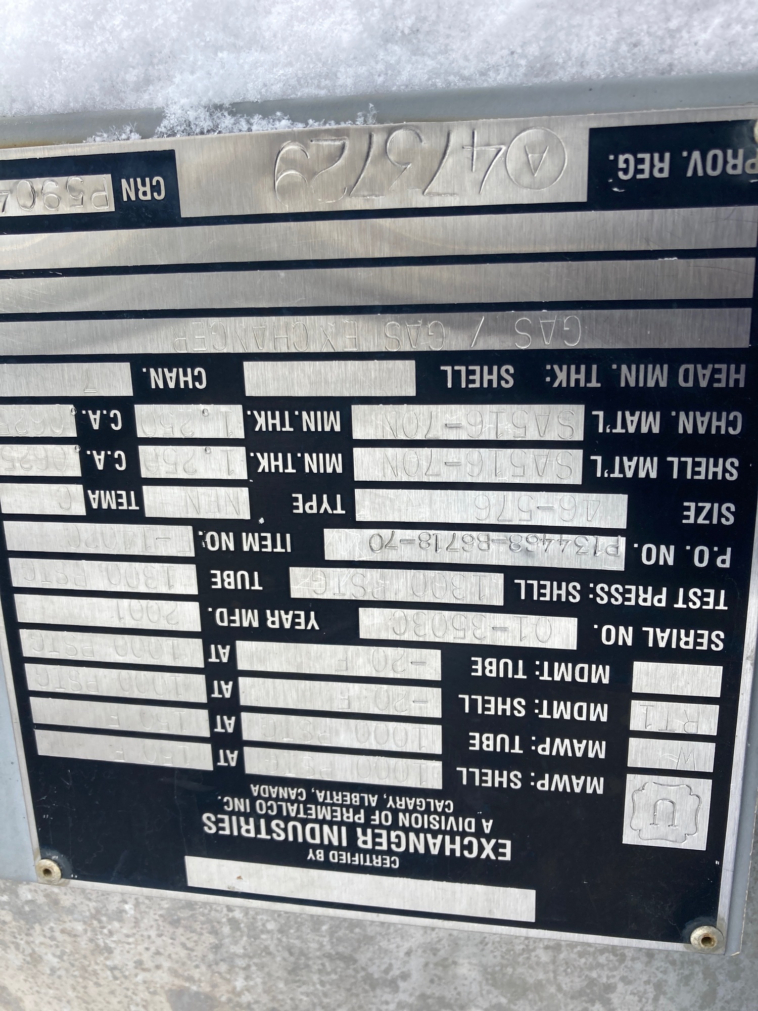 Gas to Gas Exchangers 1000 lb rated gas to gas exchangers 17.64 meters in length x 56 inch Weight 120000lbs.