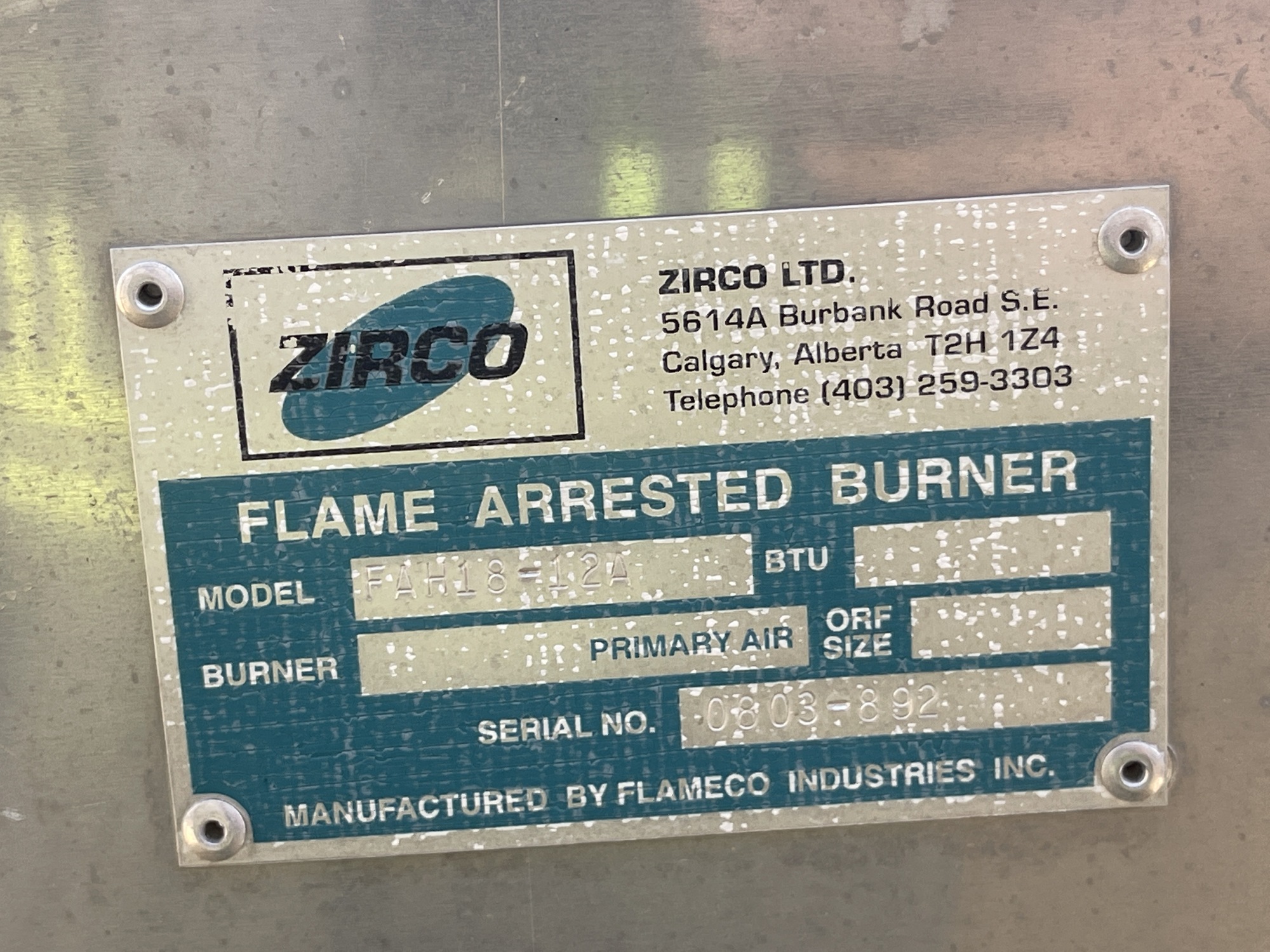 Flame Arrested Burner Tag*