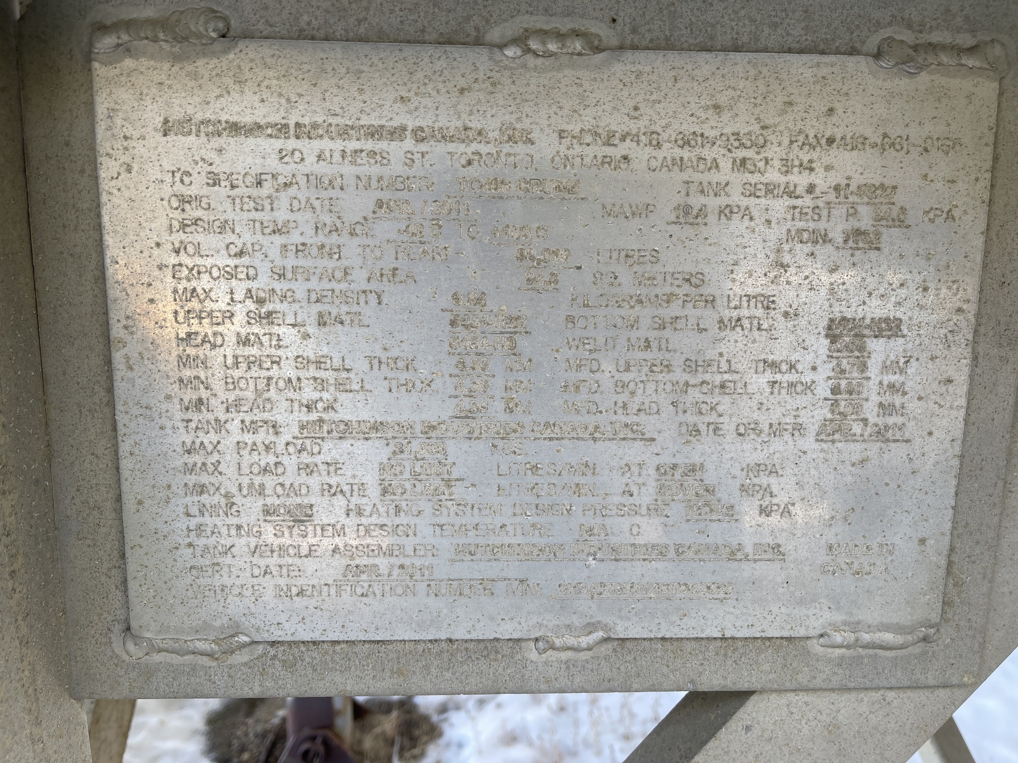 2011 10,000 USG Hutchinson Tridem DOT 406 Tank Trailer