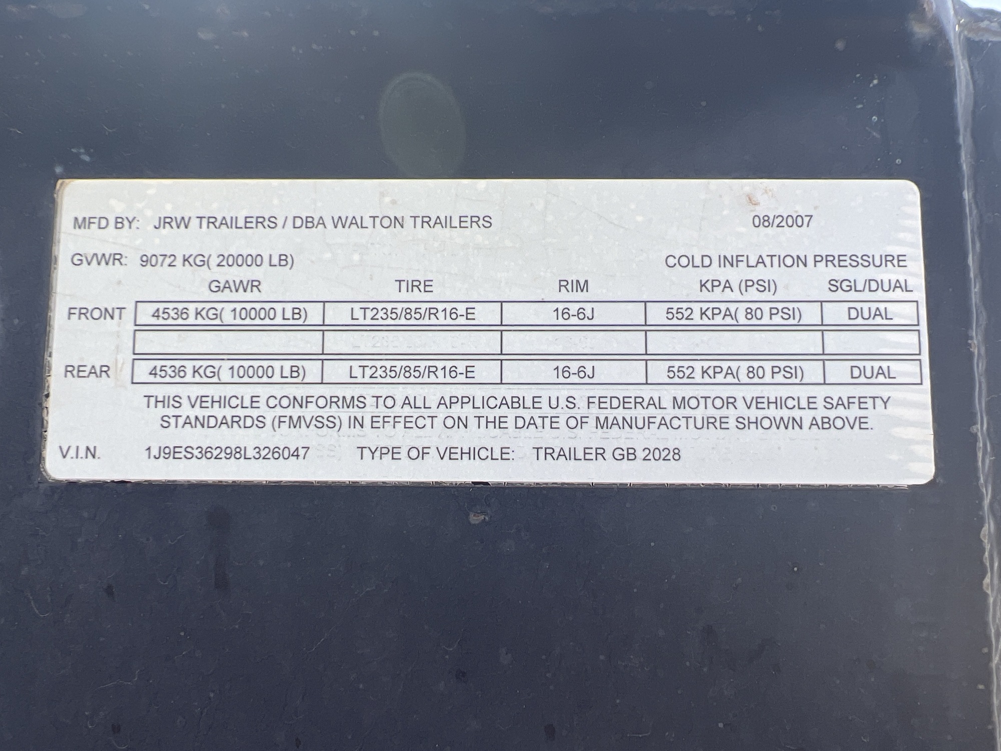 Manufacturer: JRW Trailers / DBA Walton Trailers