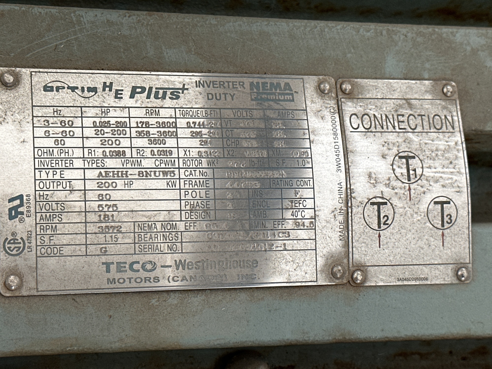 NEW/UNUSED 200HP 3572RPM 575V 3PH TECO Electric Motor