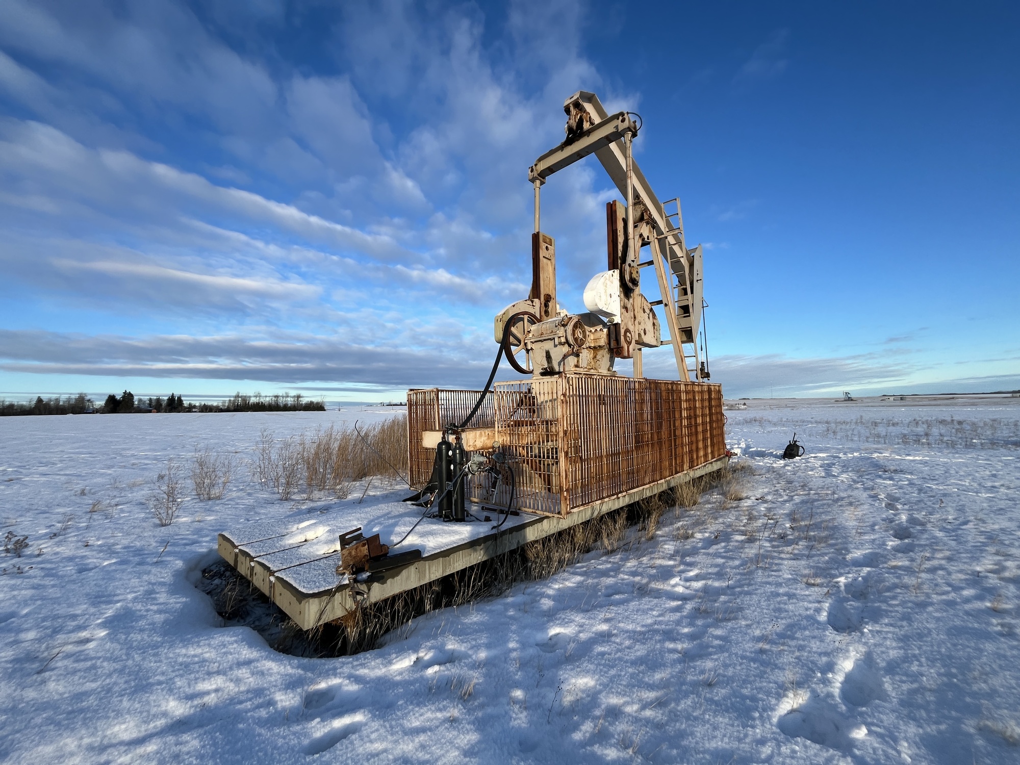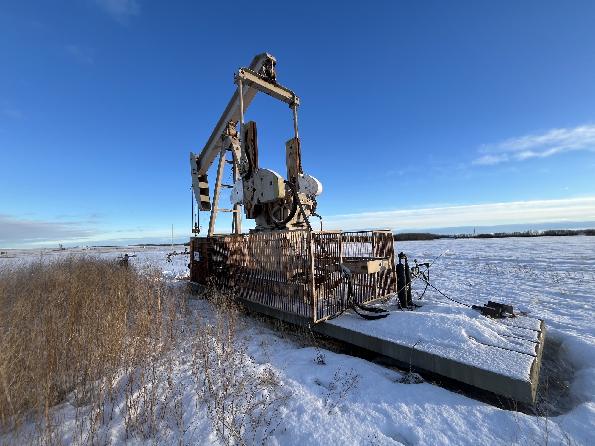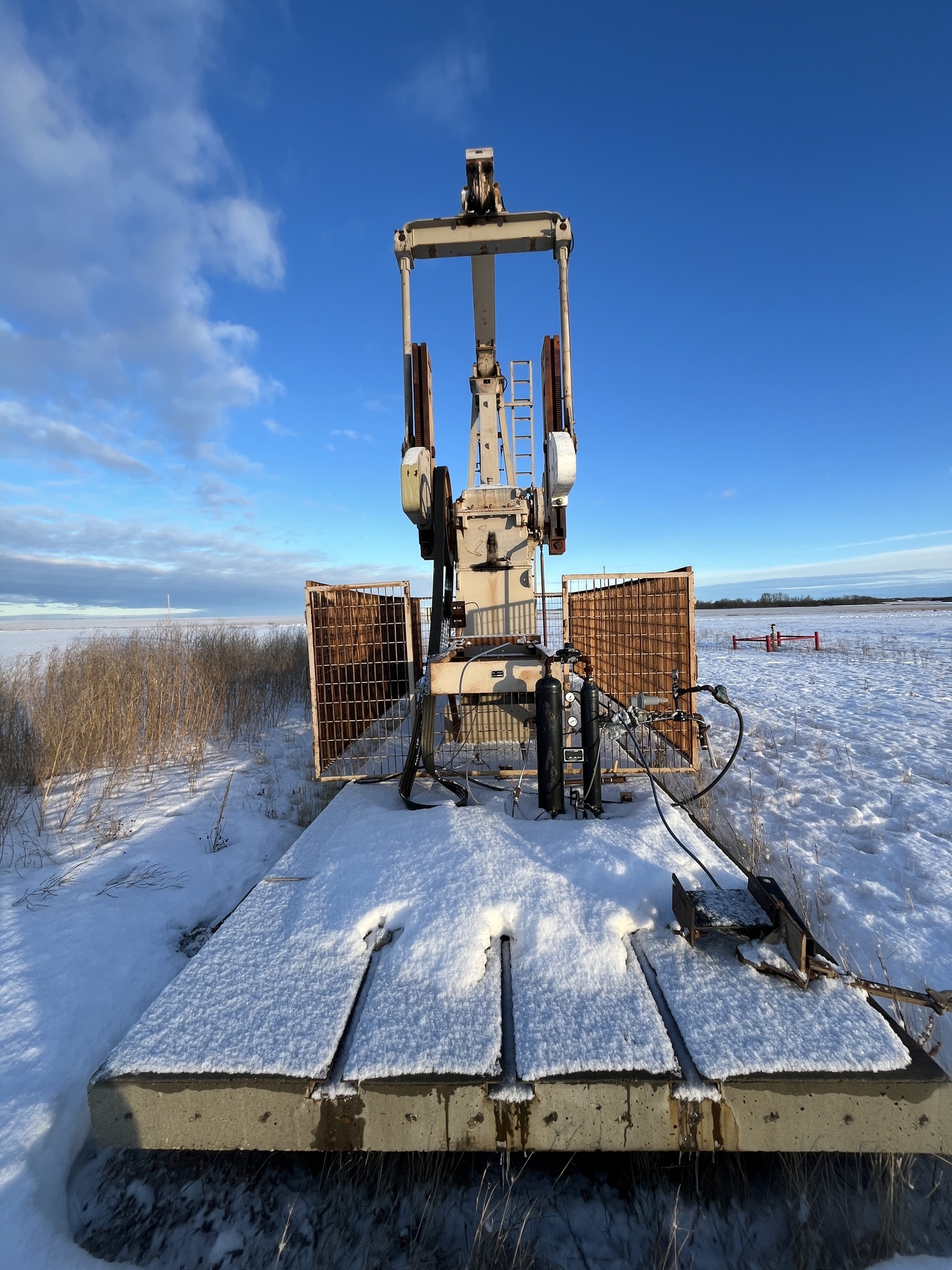 Sentry C320-256-120 pumpjack with gear reducer but engine missing on 8’x30’ cement pad on piles located at 01-07-082-03W6 (100)