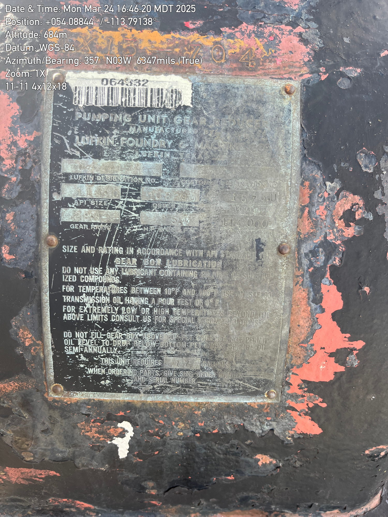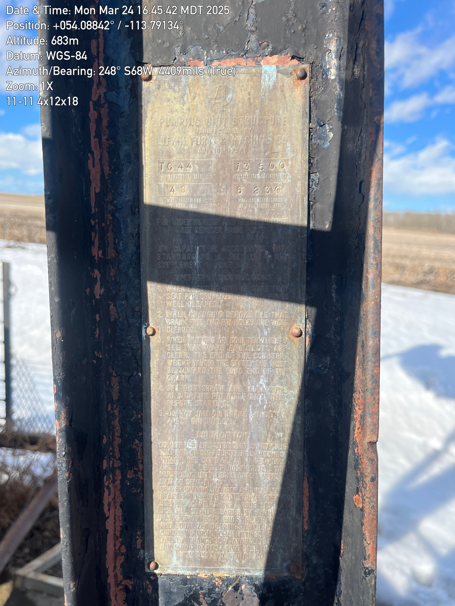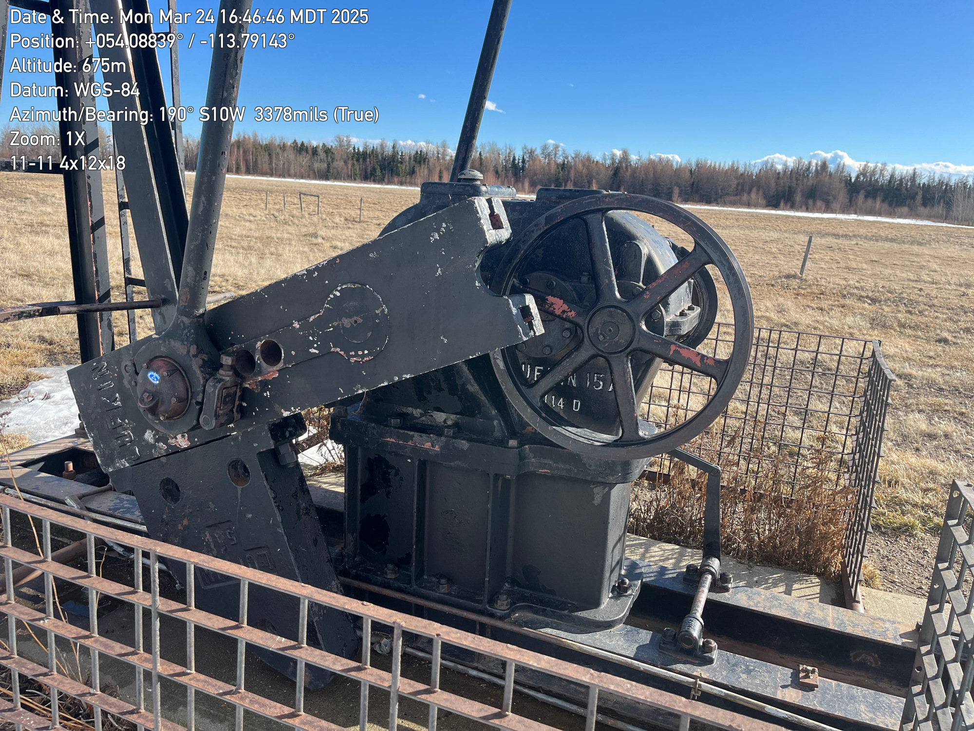 4'x12'x20’ Lufkin TC44 pumpjack with 29.4 gear reducer but engine missing located at 100/11-11-059-26W4