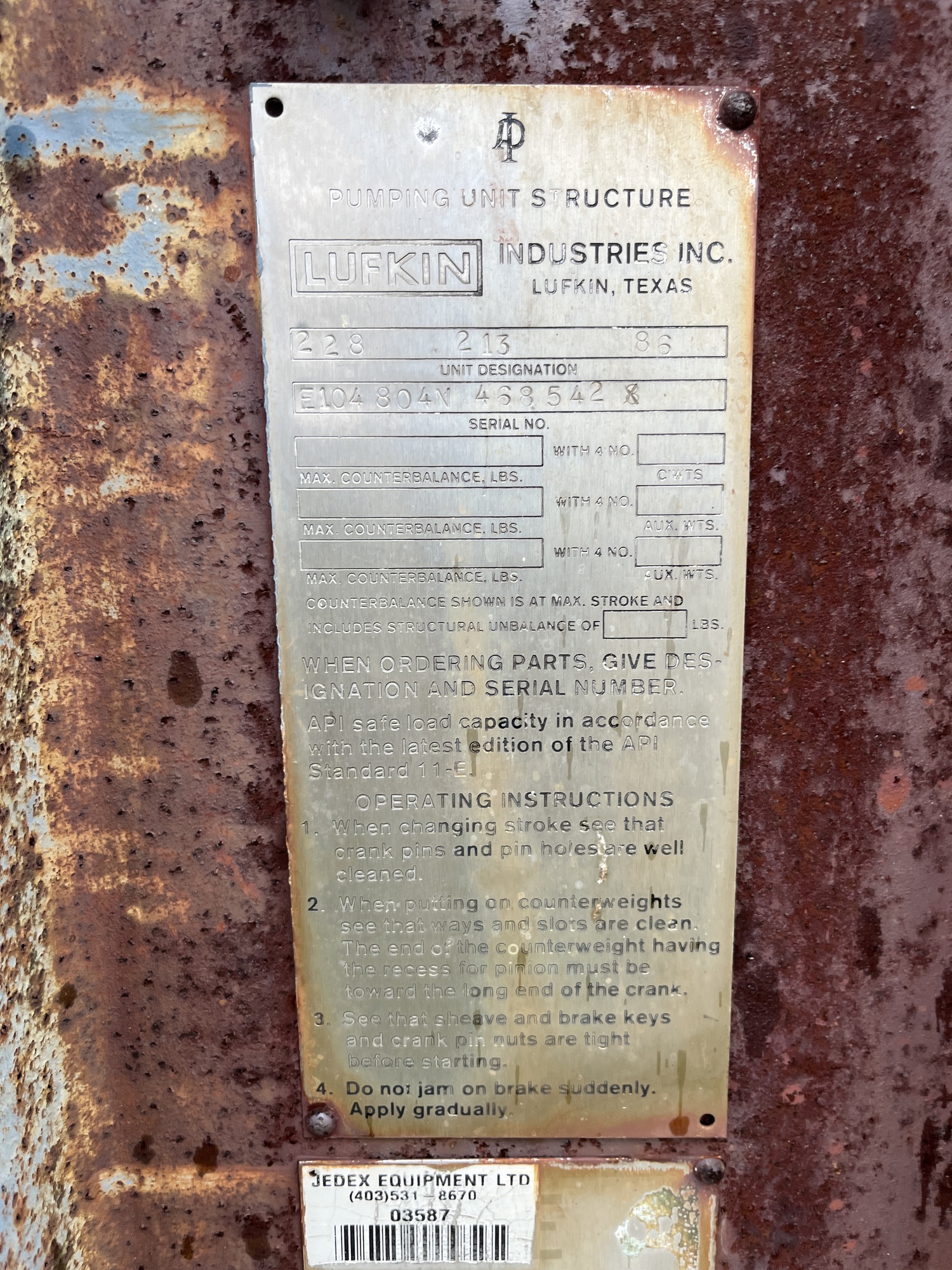228 213 86 Lufkin pumpjack with 28.45 gear reducer (engine missing) on a 20'x4' cement pad located at 10-18-058-06W5 (100)