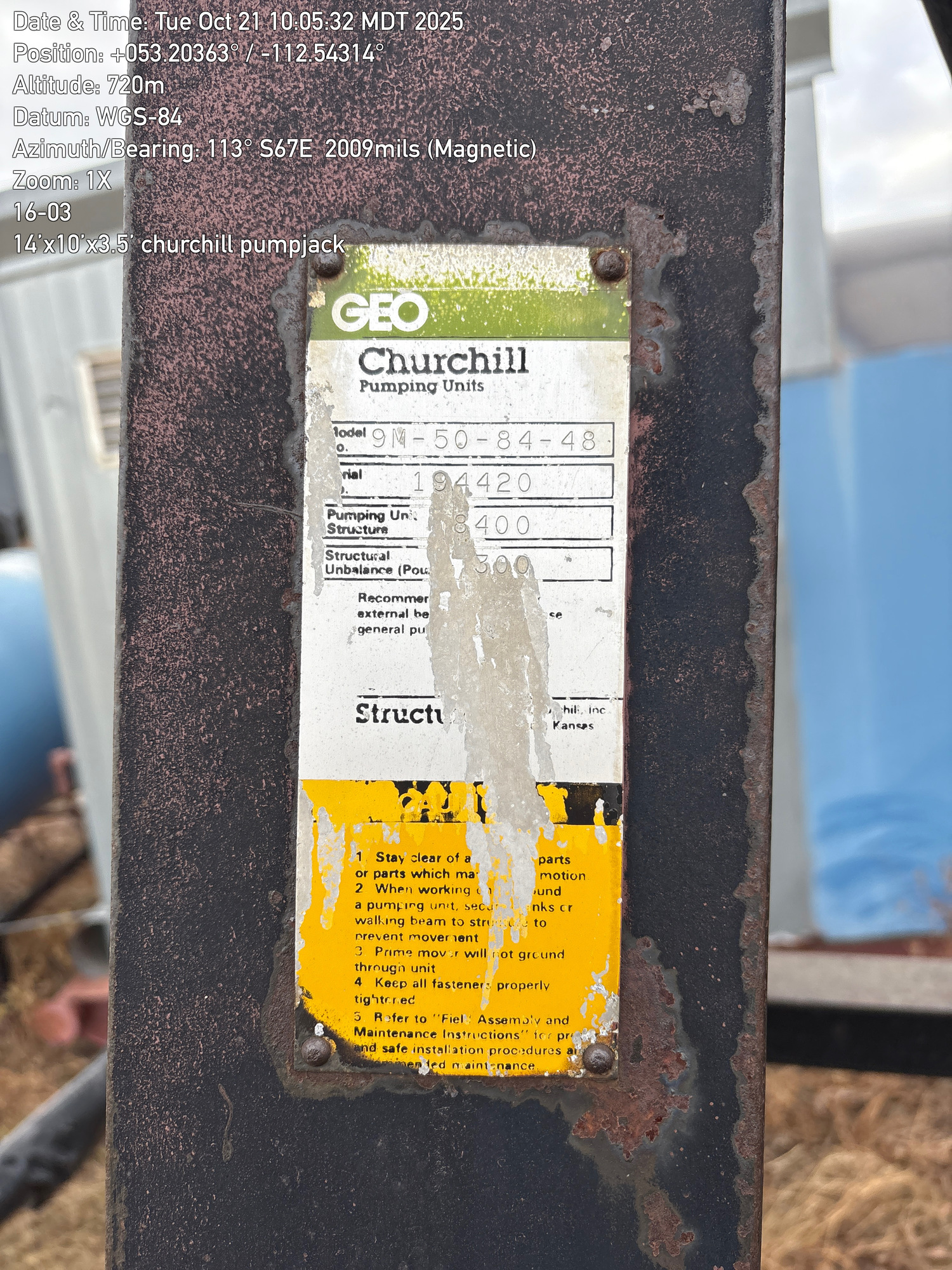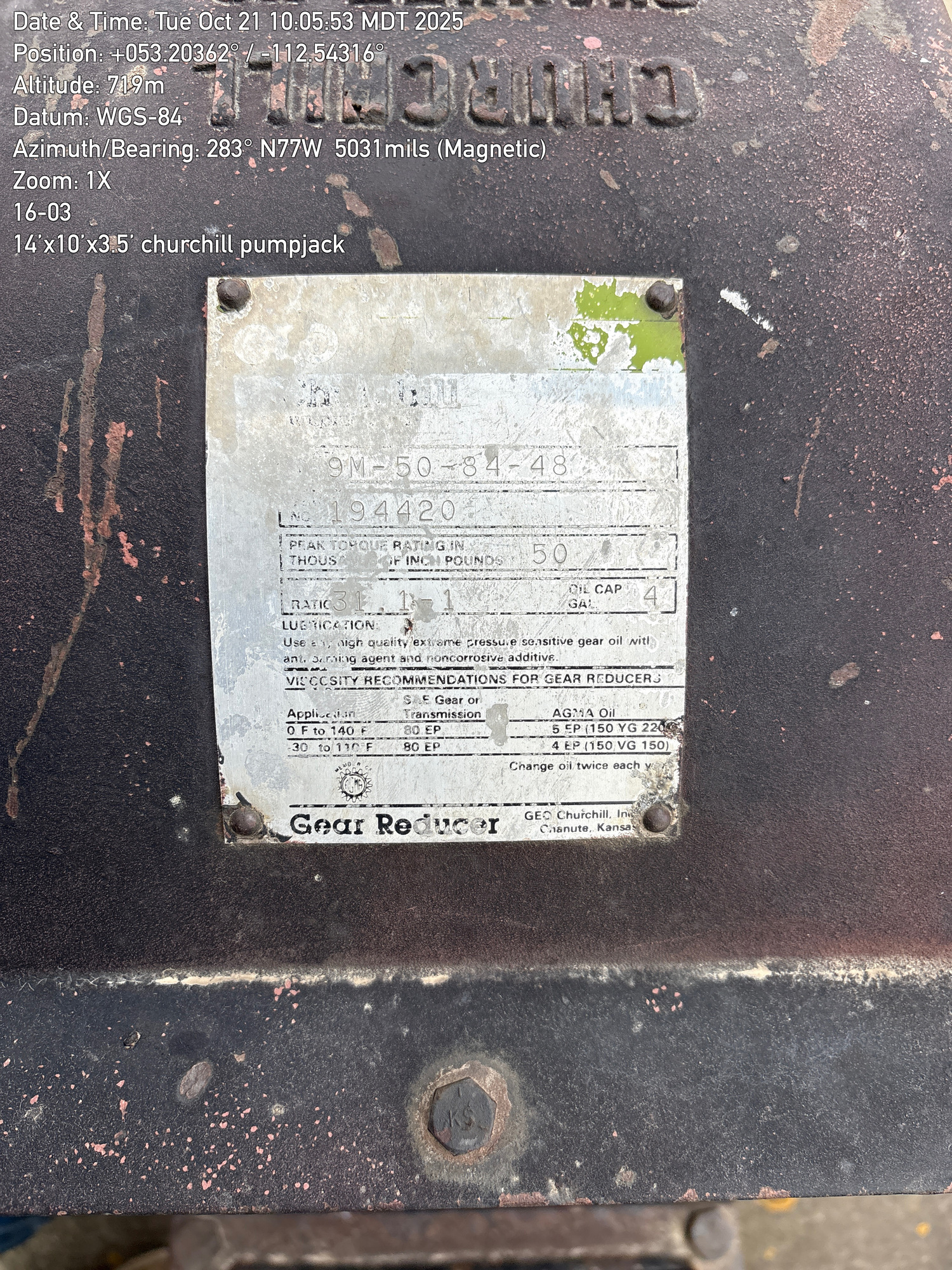 14'x10'x3.5' Churchhill 9M-50-84-48 pumpjack with 31.1 gear reducer located at 16-03-049-18W4 (100)