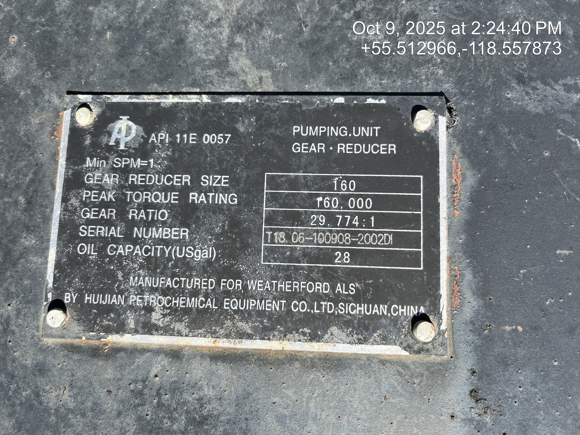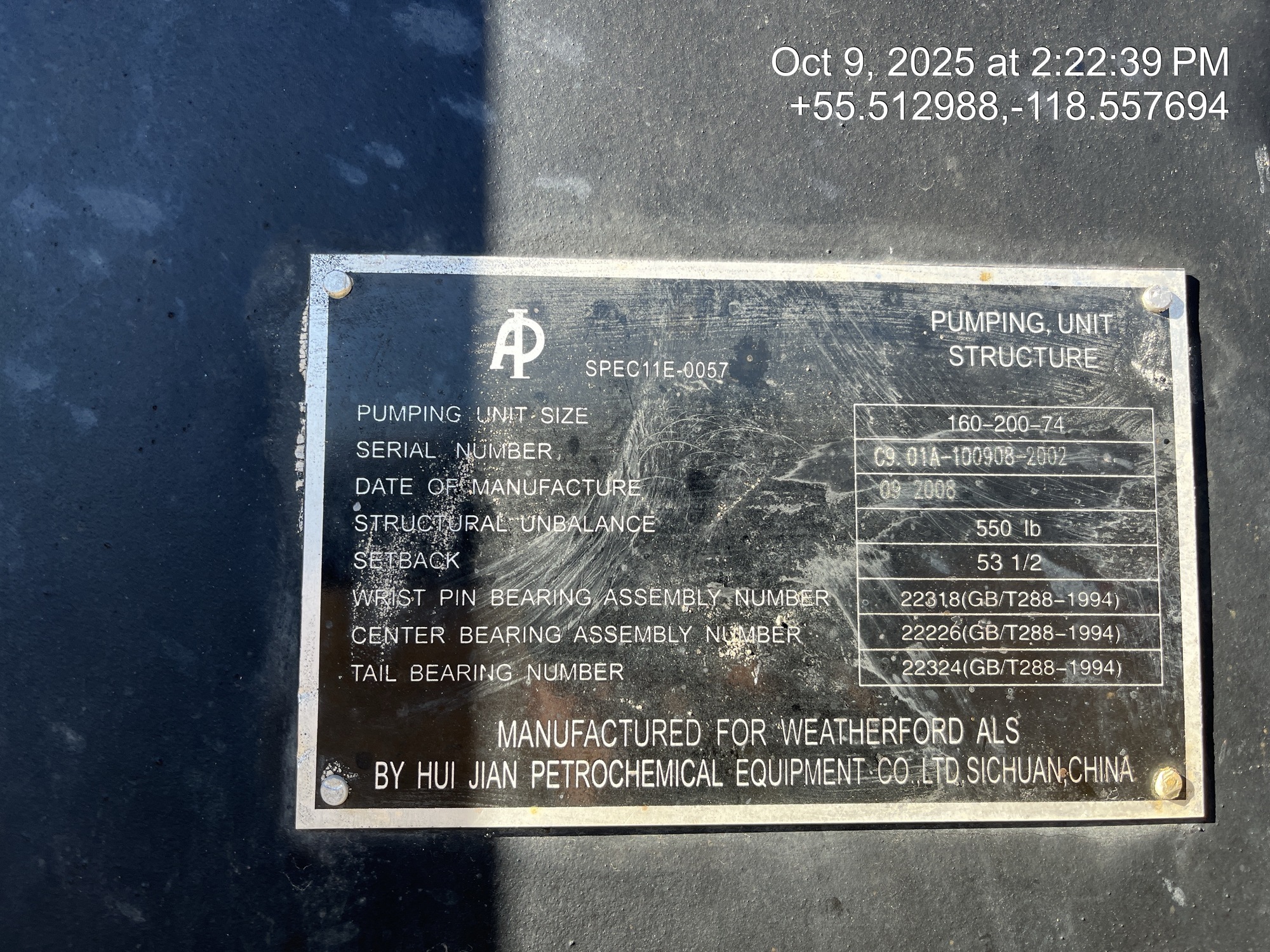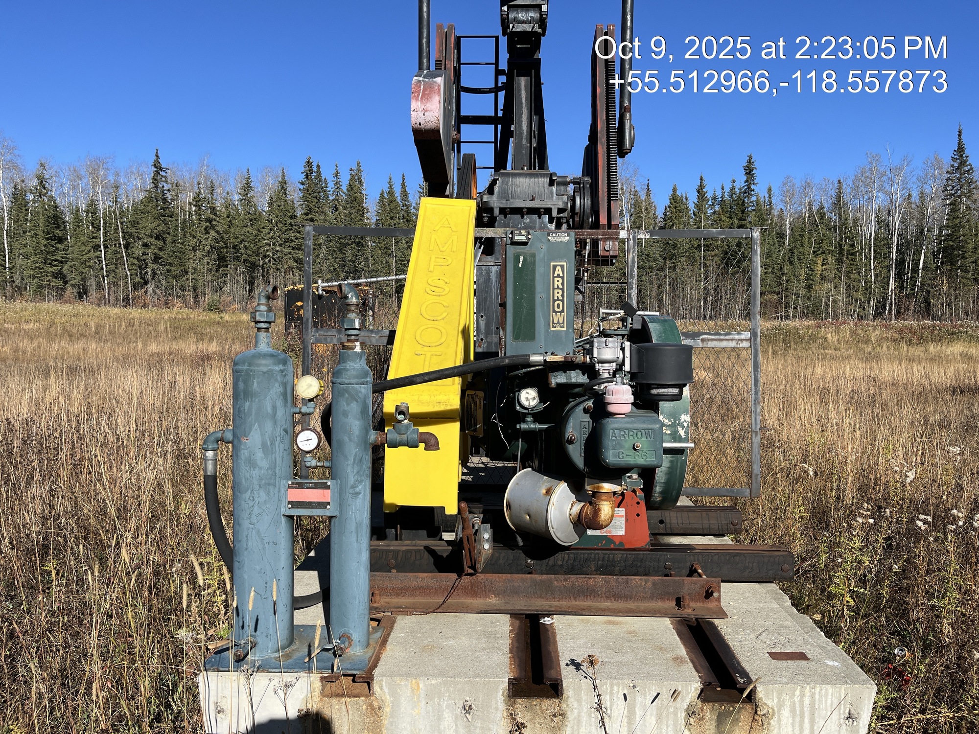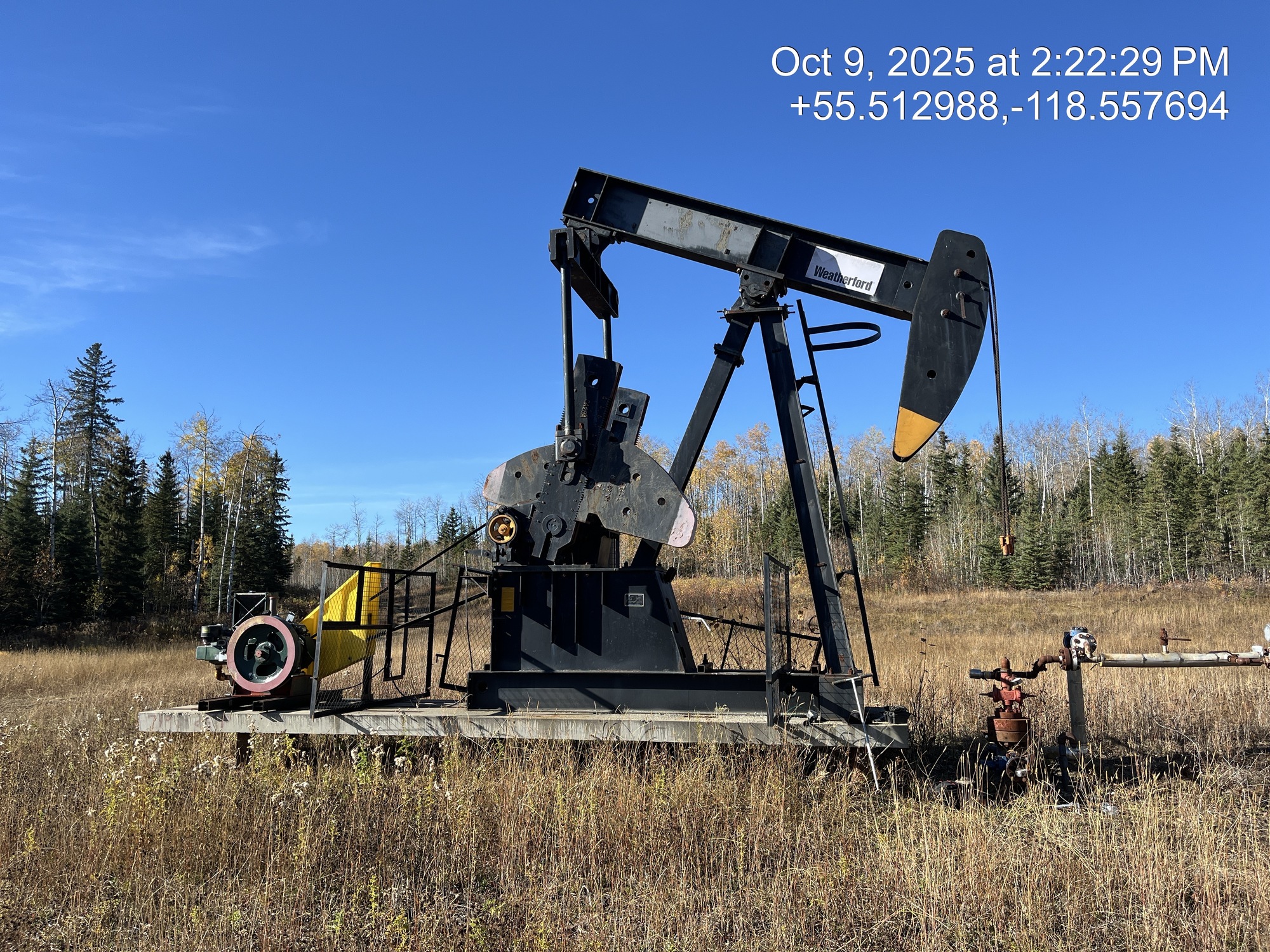 Weatherford 160-200-74 pumpjack built in 2008 with a 29.774 gear reducer and 13 HP Arrow C-66 engine on 6' x 26' cement pad on piles located at 11-21-075-04W6 (100/10-21 downhole)