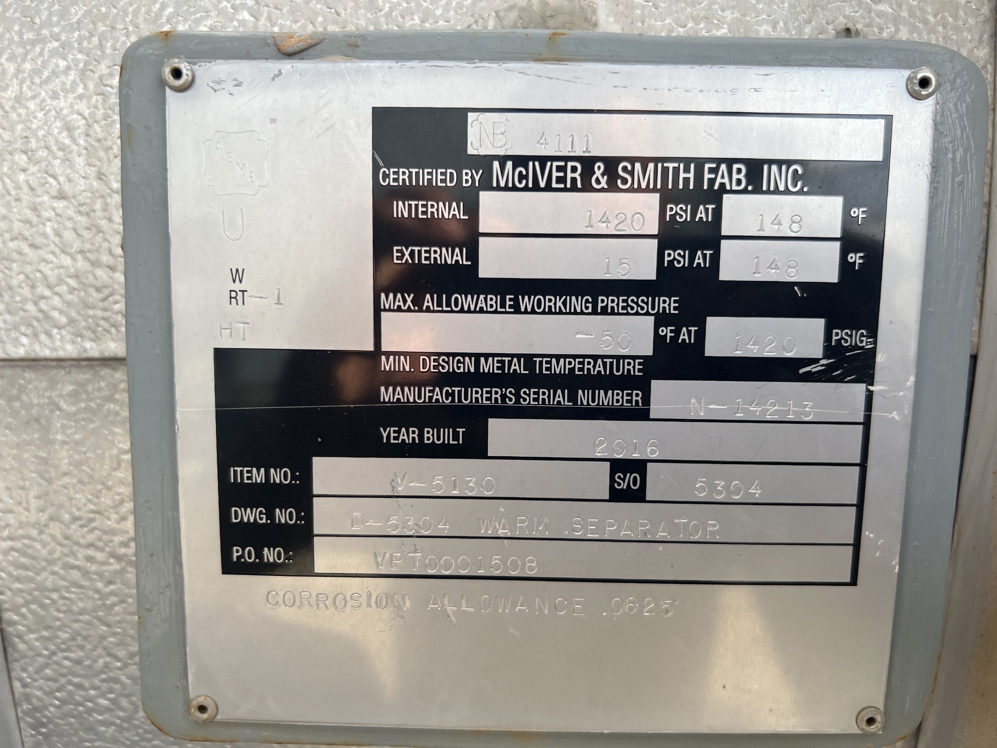 MAWP: - 50 F @ 1420 PSIG