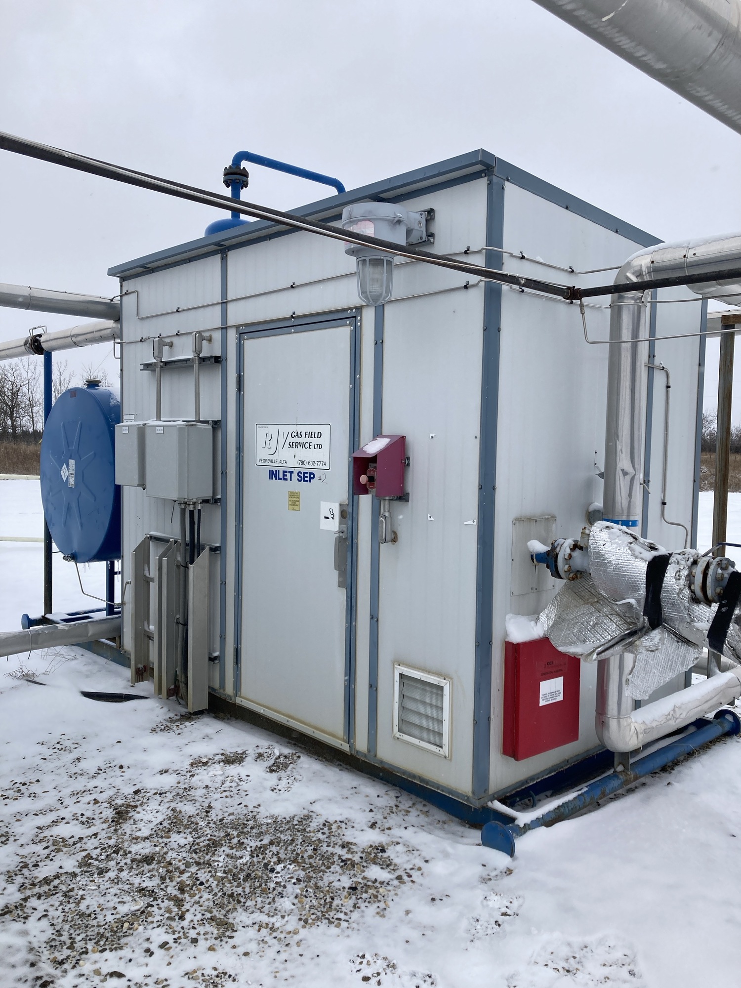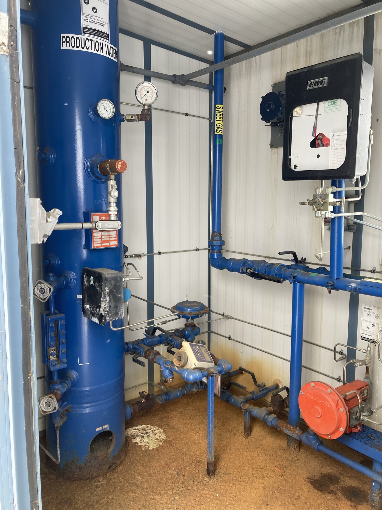 Dual phase separator package with dry flow meter, fuel gas scrubber, 24”x24” Catadyne and chemical injector