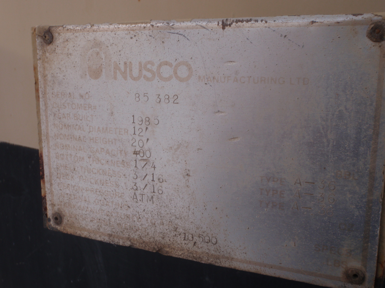 400 BBL ATMOSPHERIC TANK BUILT 1985