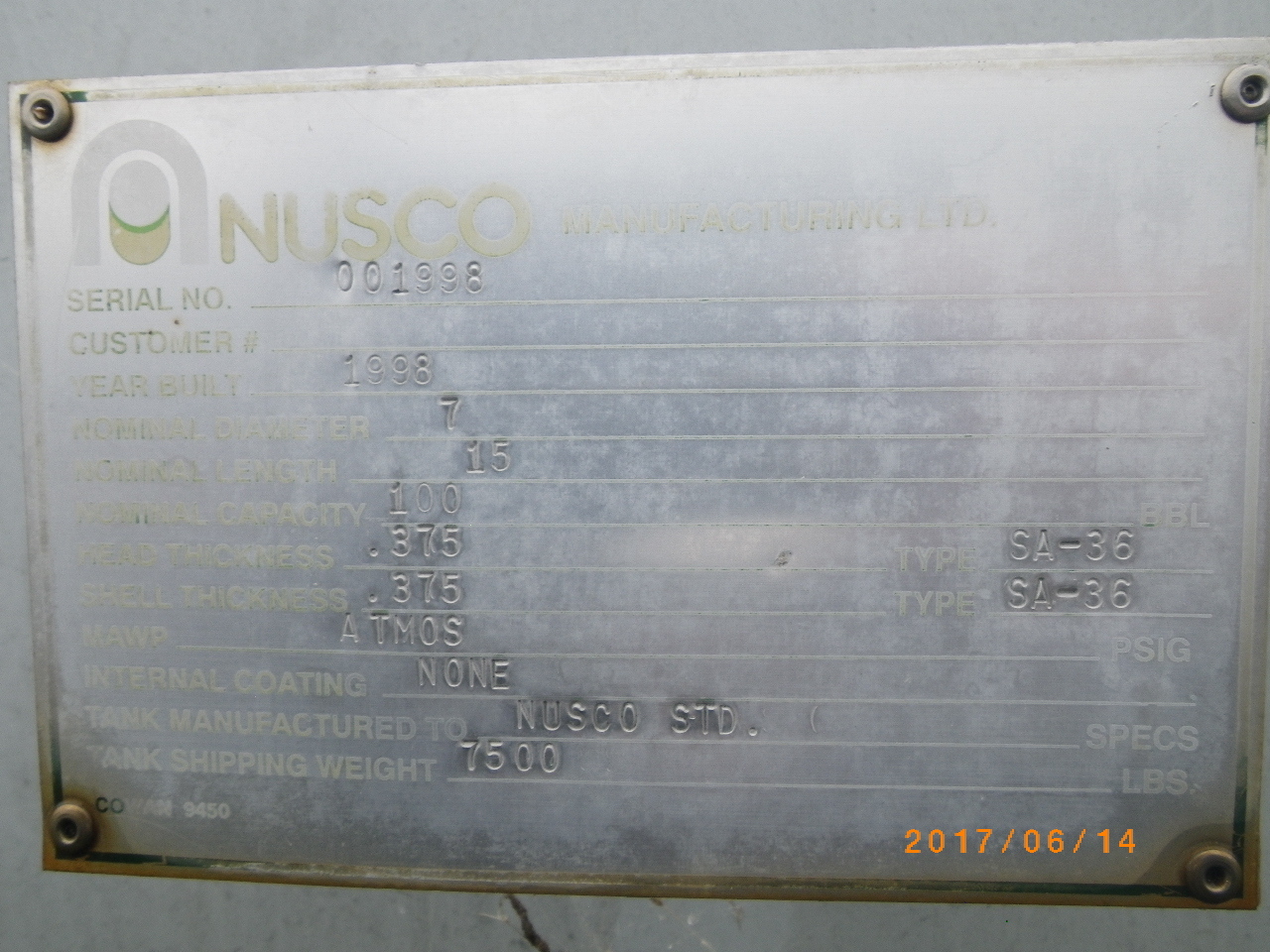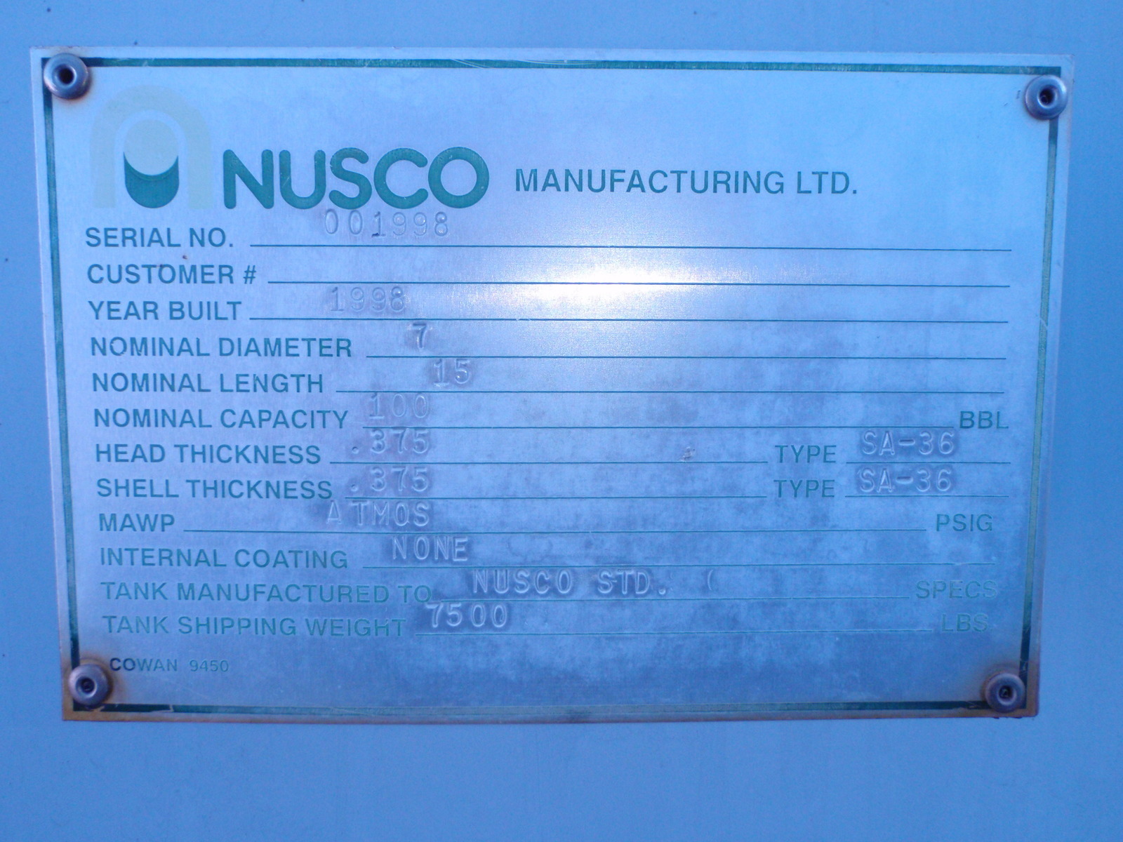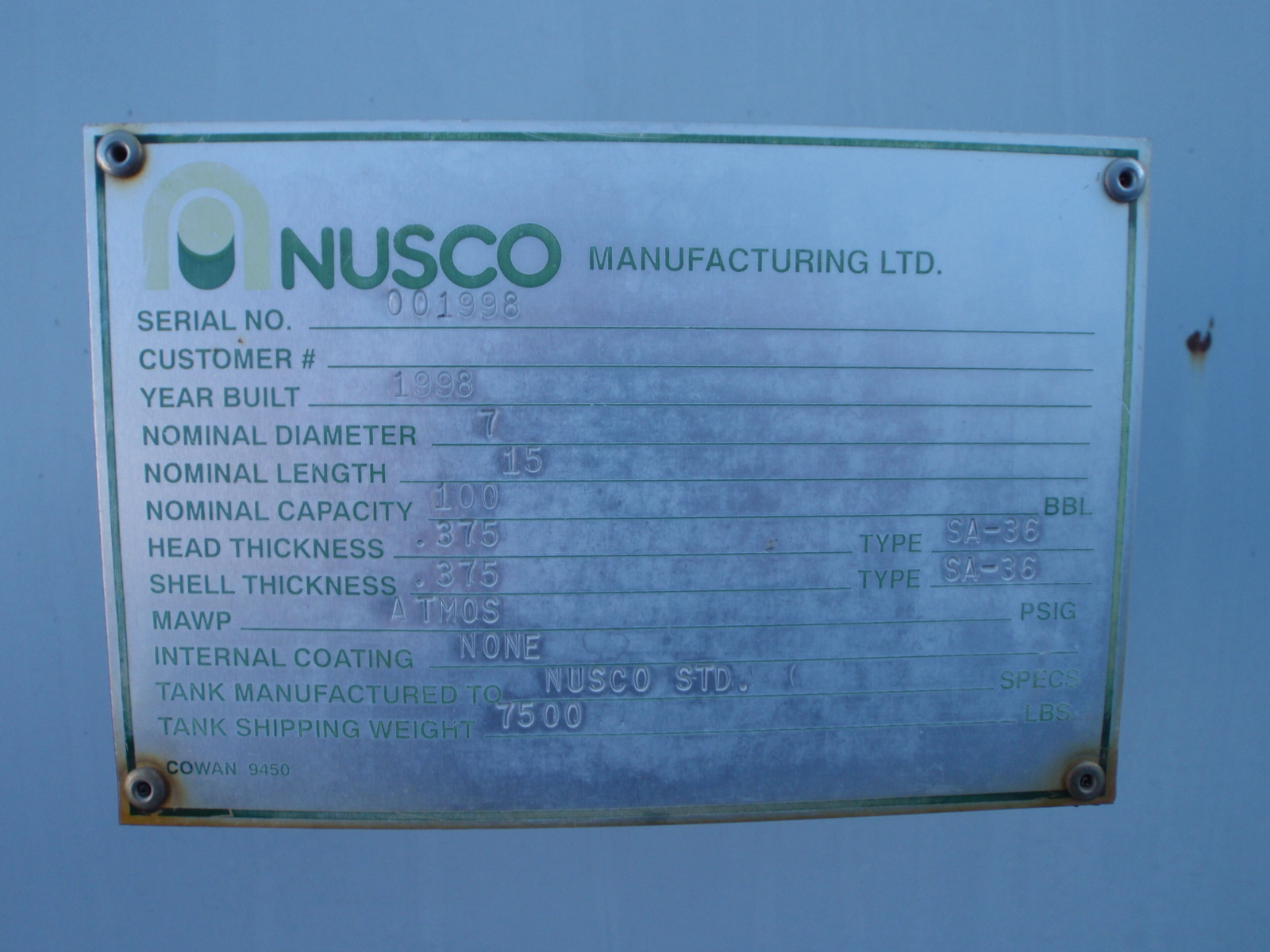 100 BBL, BUILT 1998, SIZE 7' X 15'