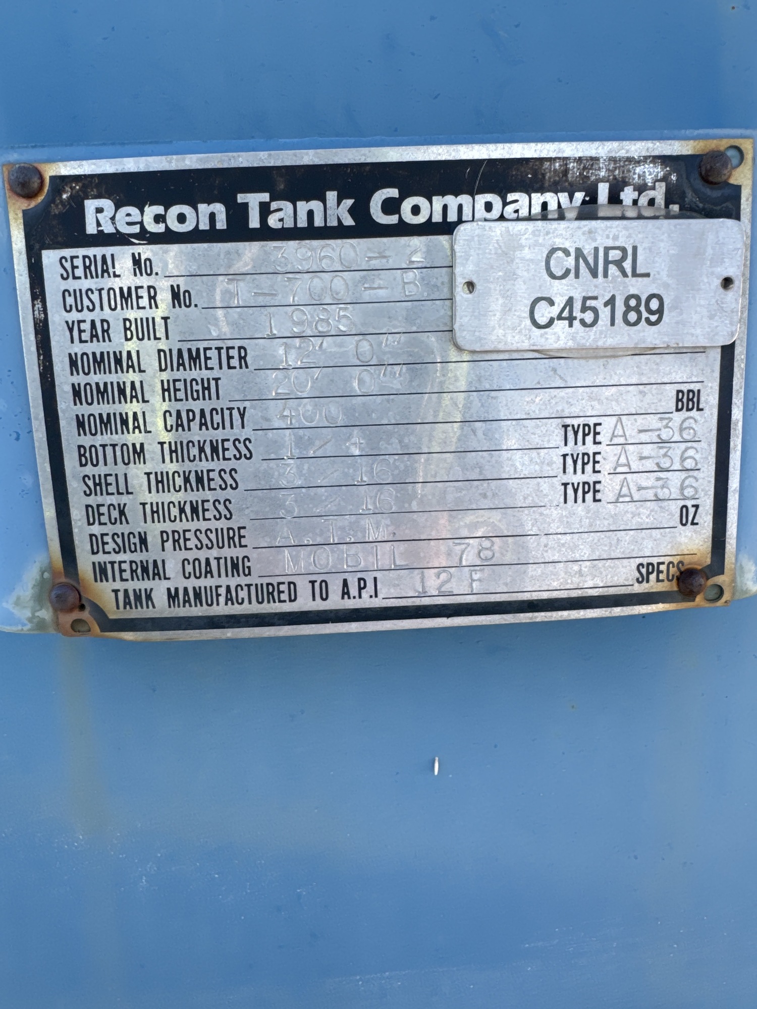 Tank Capacity (BBL) 400