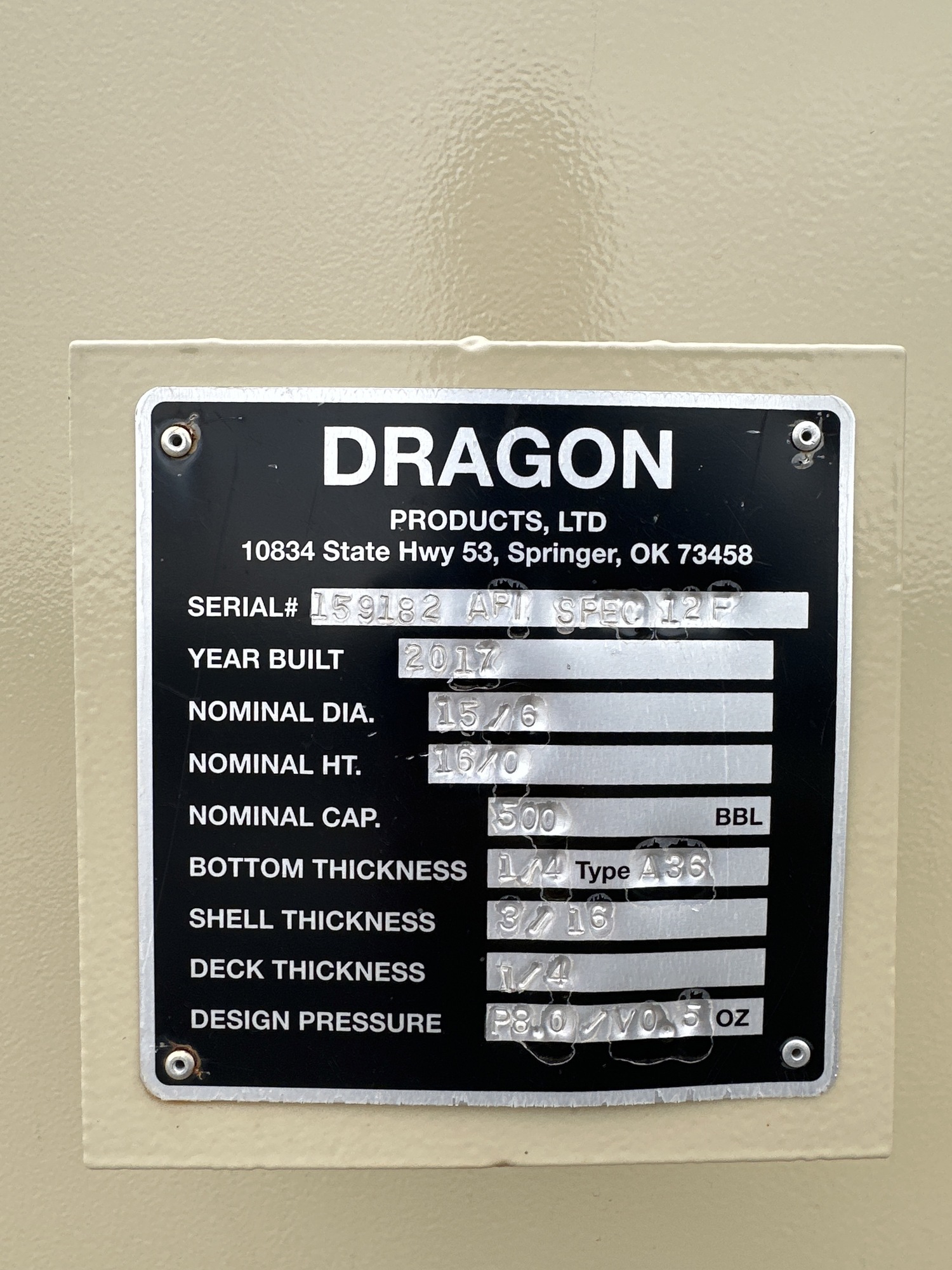 500 BBL 0.5 oz Storage Tank